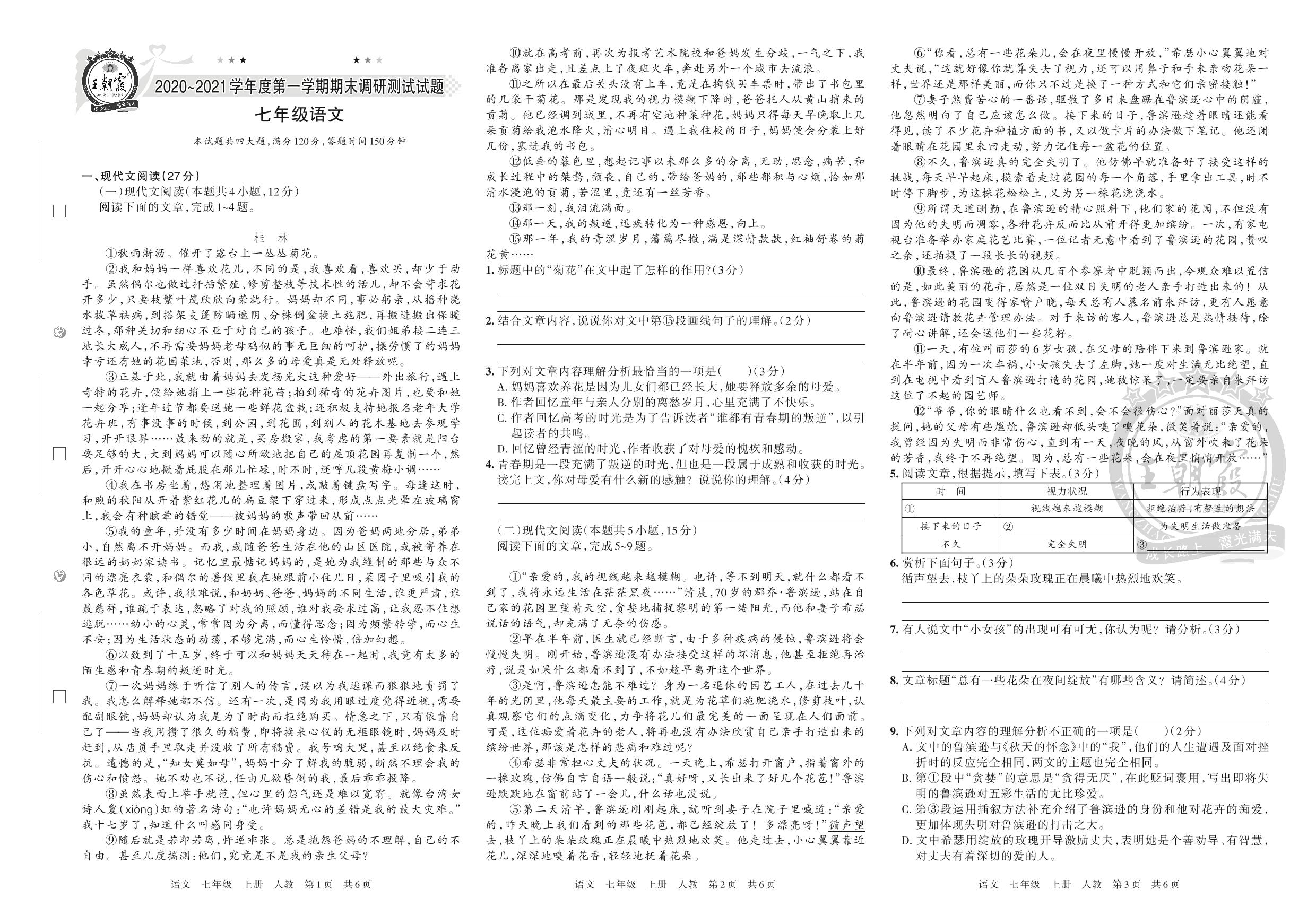 随州市曾都区2020~2021学年度第一学期期末调研测试试题七年级语文(人教版)