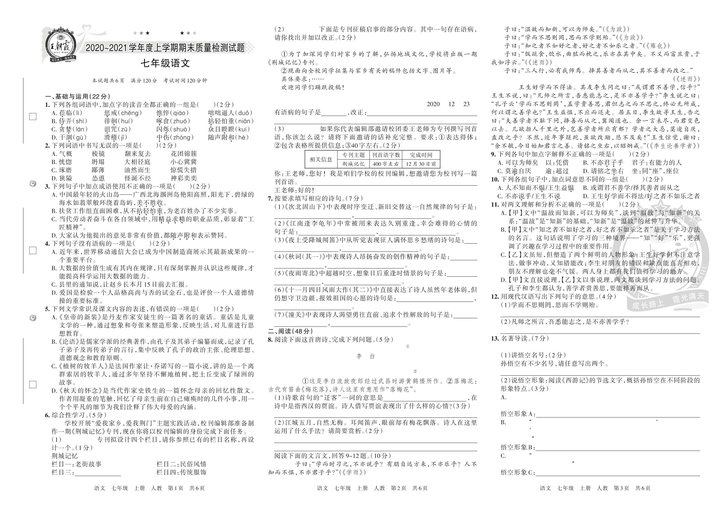 荆门市2020~2021学年度上学期期末质量检测试题七年级语文(人教版)