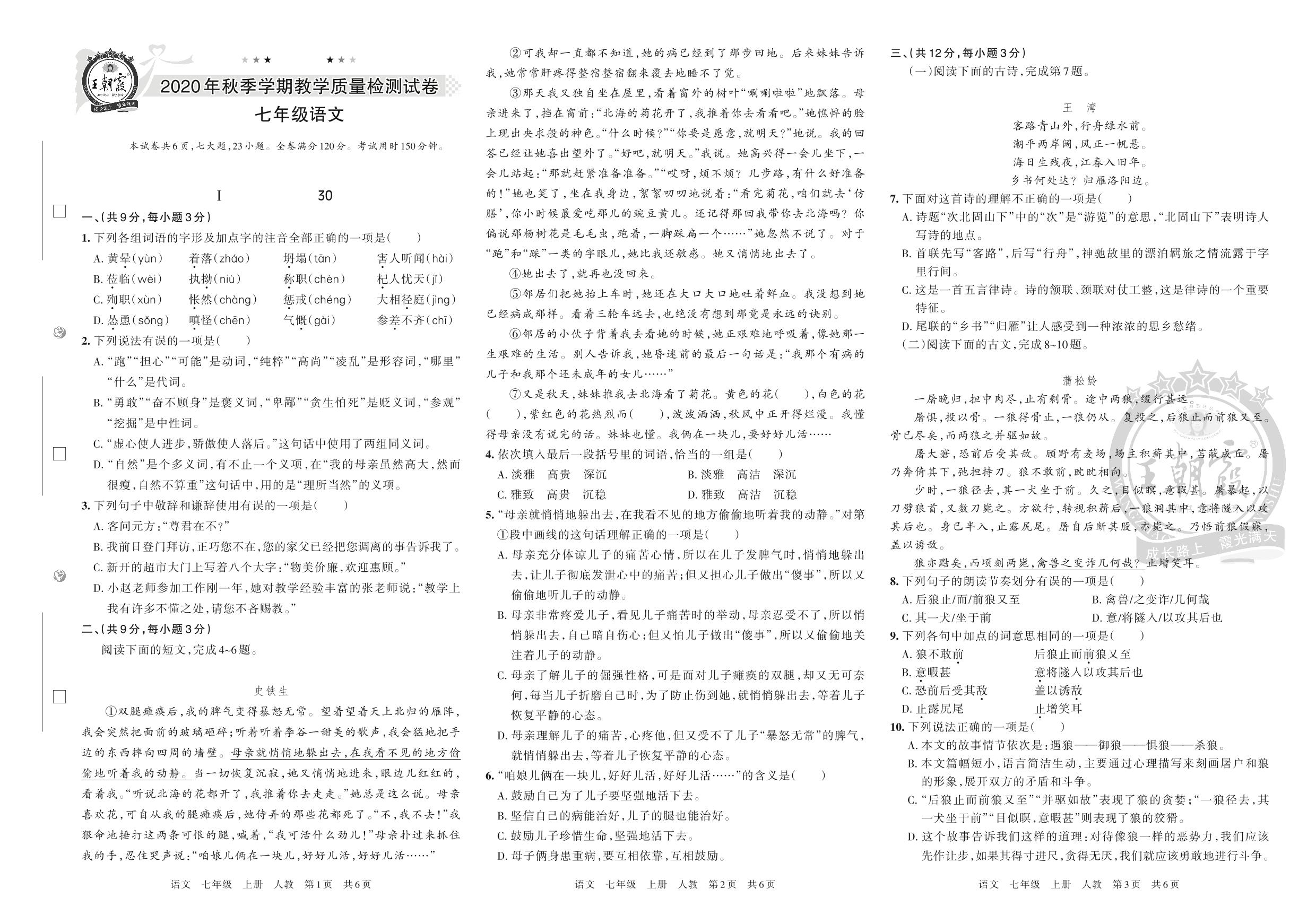 鄂州市2020年秋季学期教学质量检测试卷七年级语文(人教版)