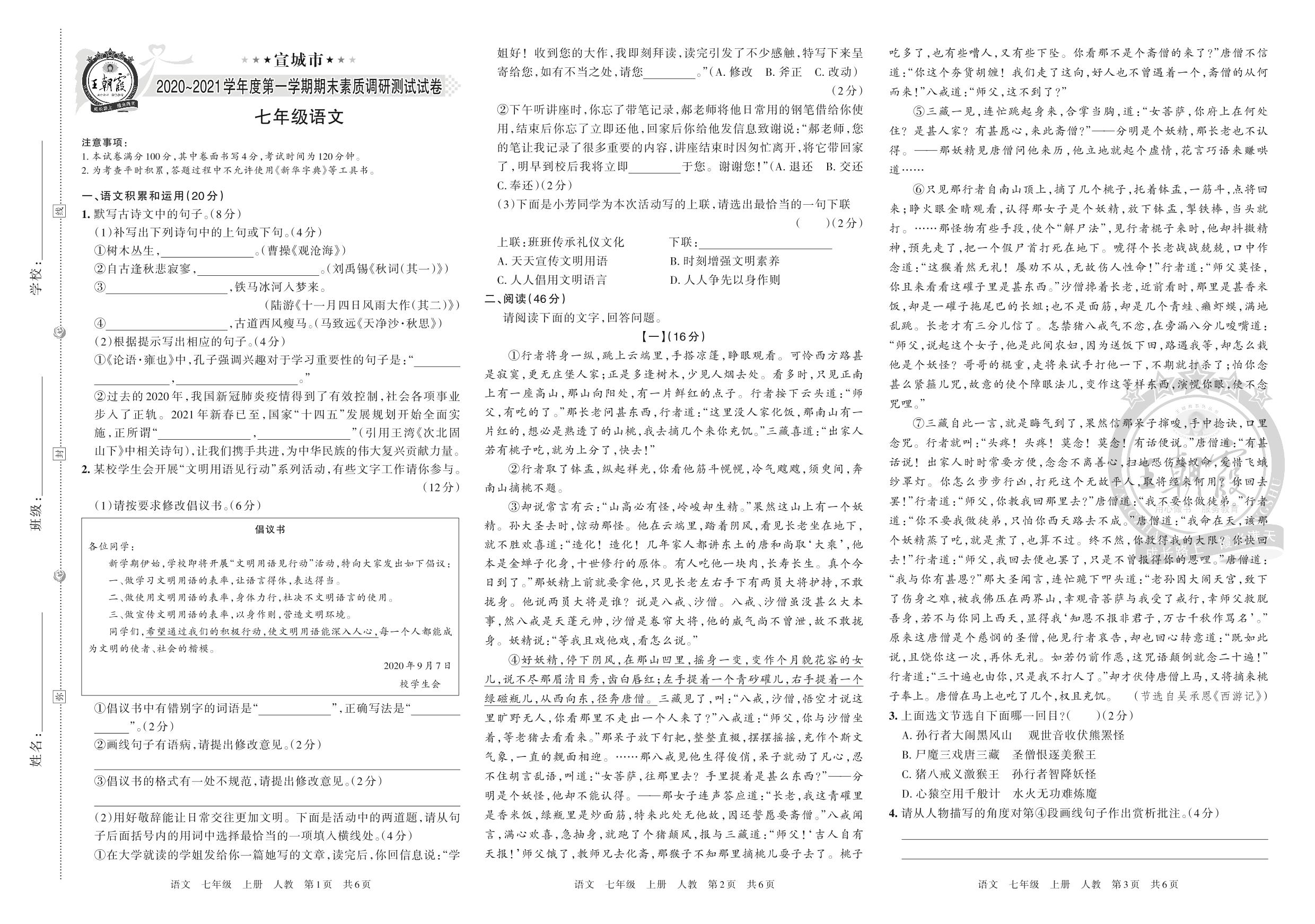 宣城市2020~2021学年度第一学期期末素质调研测试试卷七年级语文(人教版)