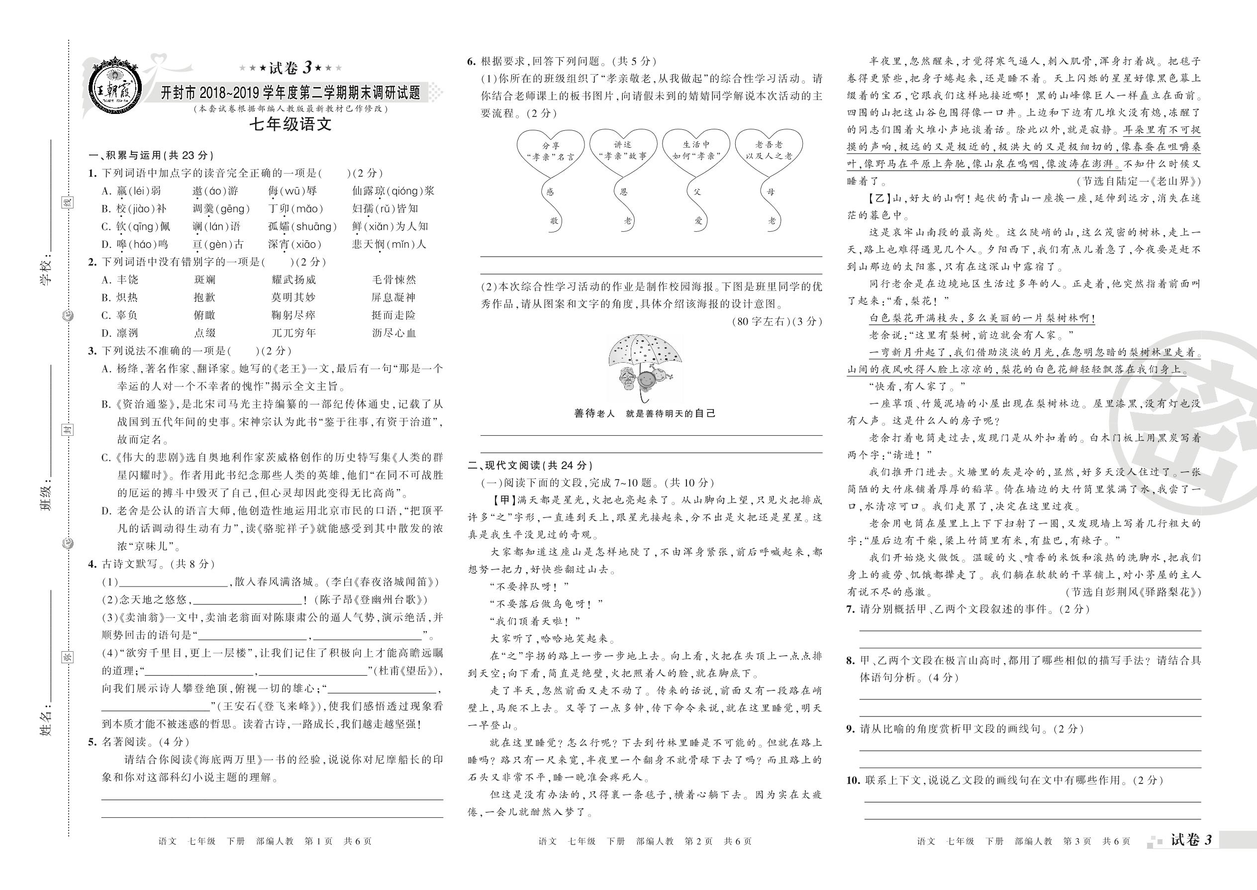 2018-2019学年第二学期开封市七年级语文试卷(人教版)【3】