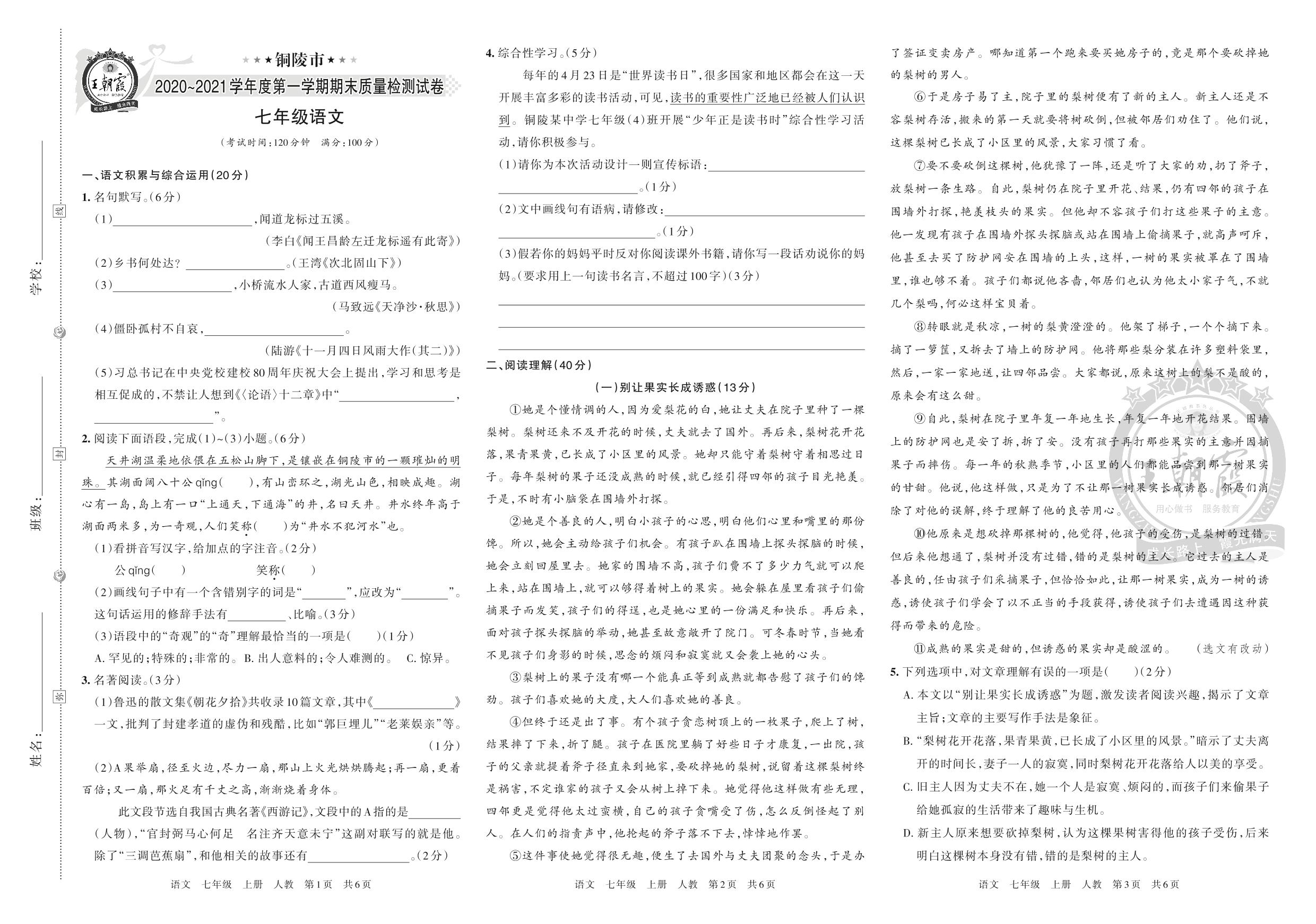 铜陵市2020~2021学年度第一学期期末质量检测试卷七年级语文(人教版)
