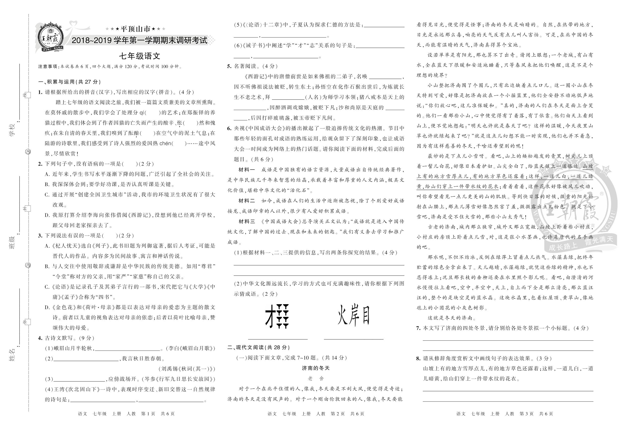 平顶山市2018~2019学年第一学期期末调研考试七年级语文(人教版)