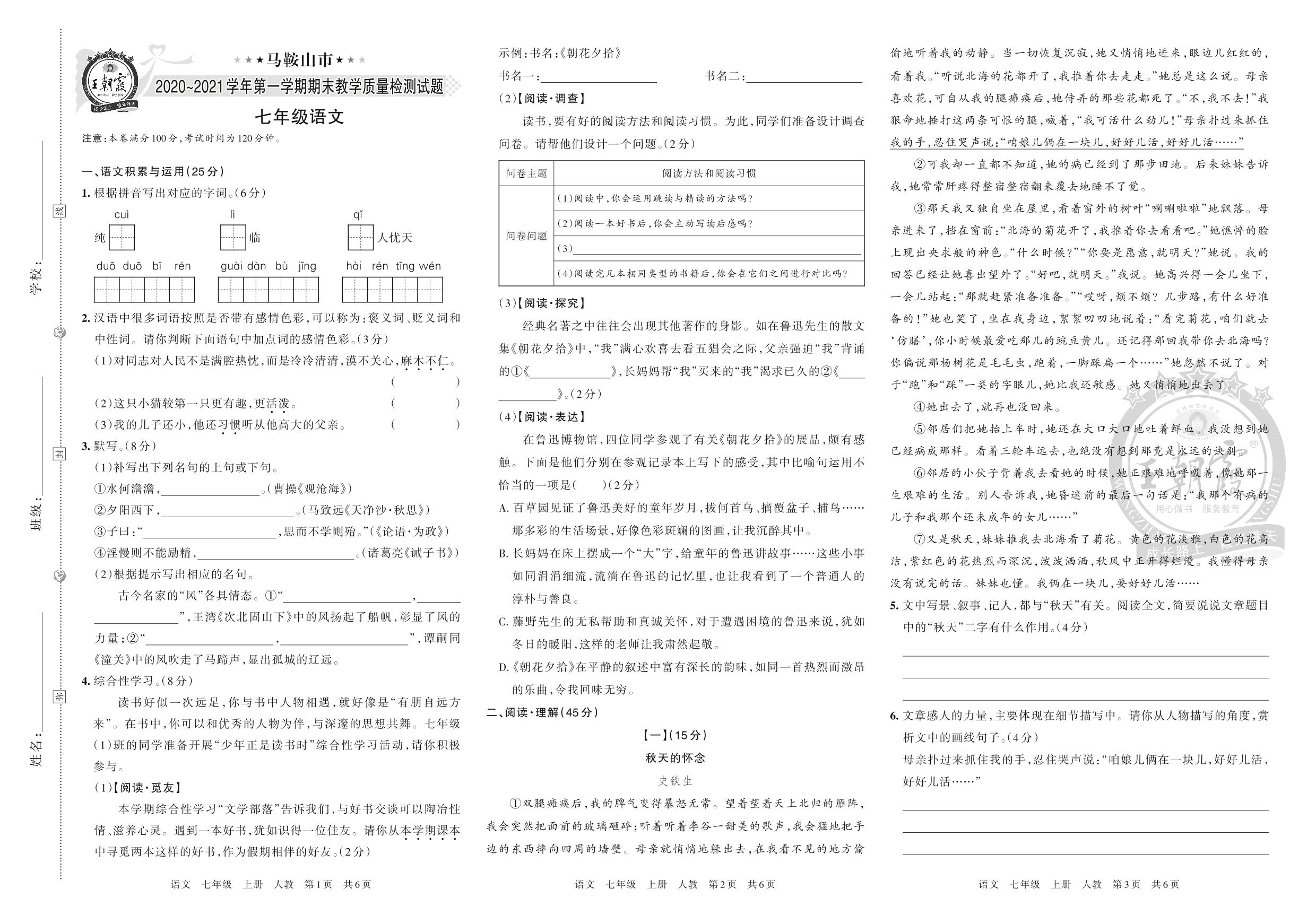 马鞍山市2020~2021学年第一学期期末教学质量检测试题七年级语文(人教版)