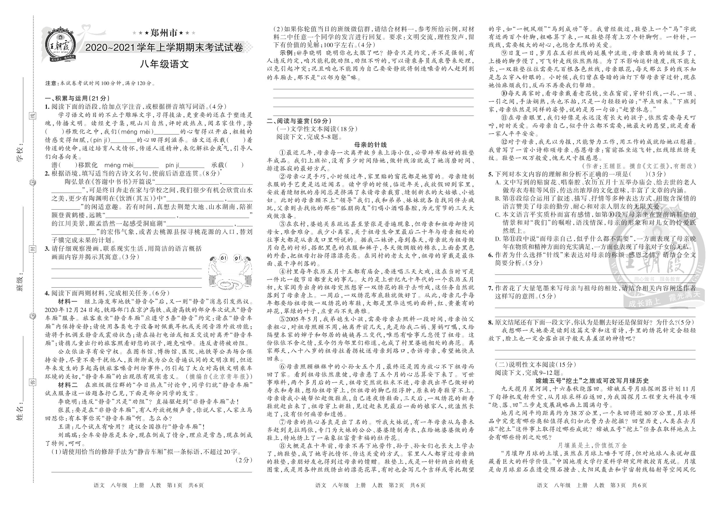 郑州市2020~2021学年上学期期末考试试卷八年级语文(人教版)
