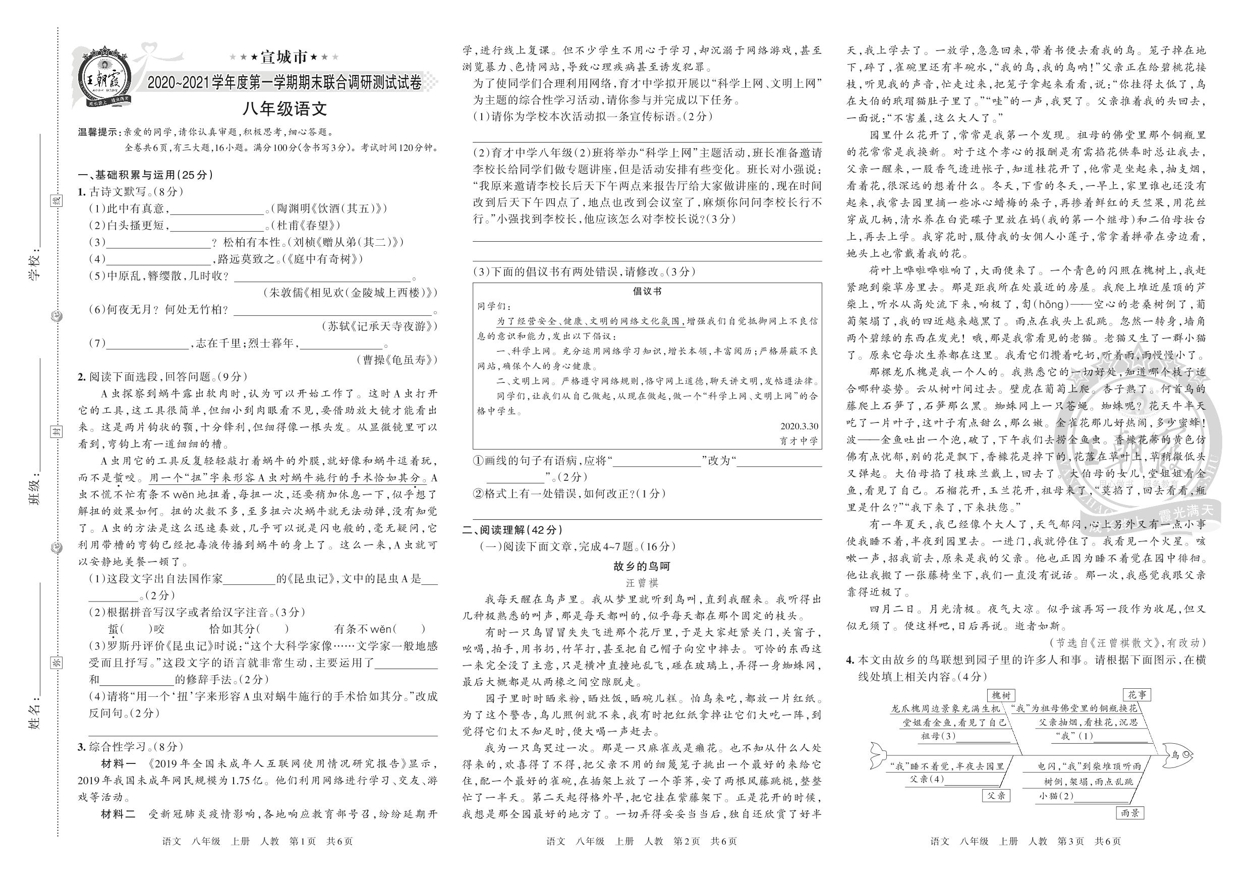 宣城市2020~2021学年度第一学期期末联合调研测试试卷八年级语文(人教版)