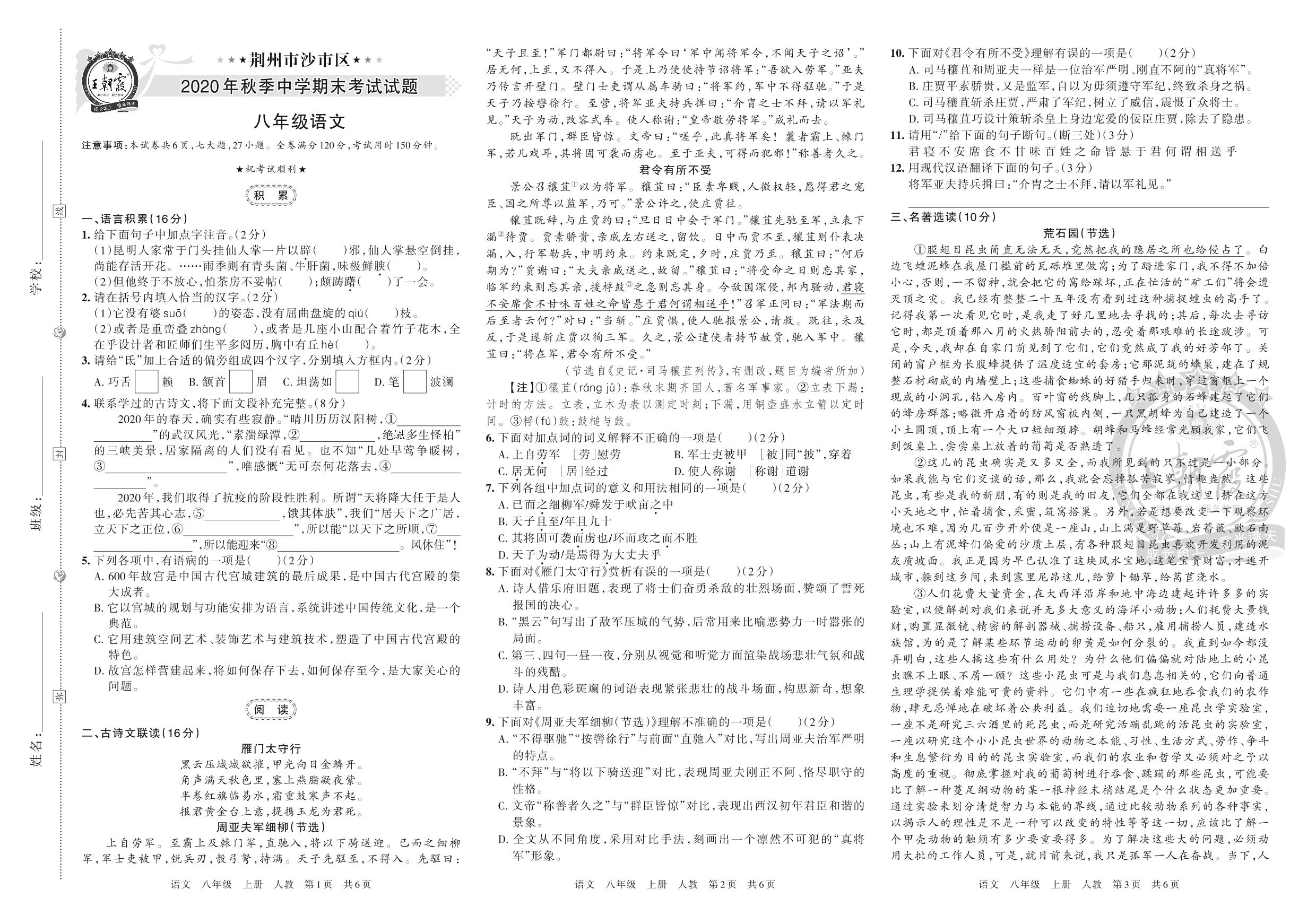荆州市沙市区2020年秋季中学期末考试试题八年级语文(人教版)
