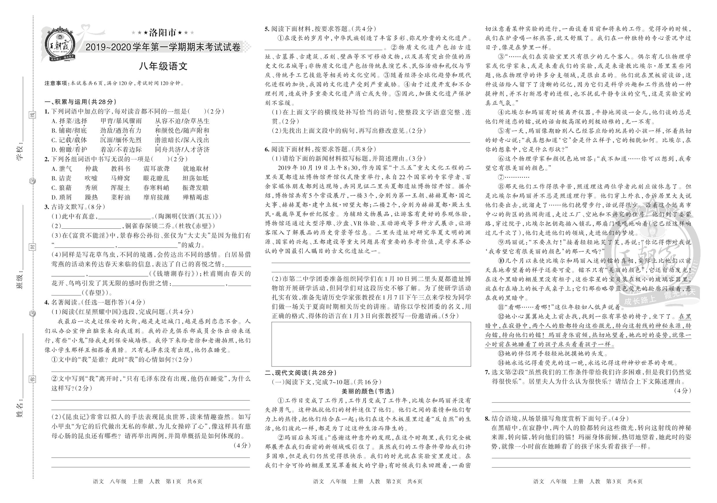 洛阳市2019~2020学年第一学期期末考试试卷八年级语文(人教版)