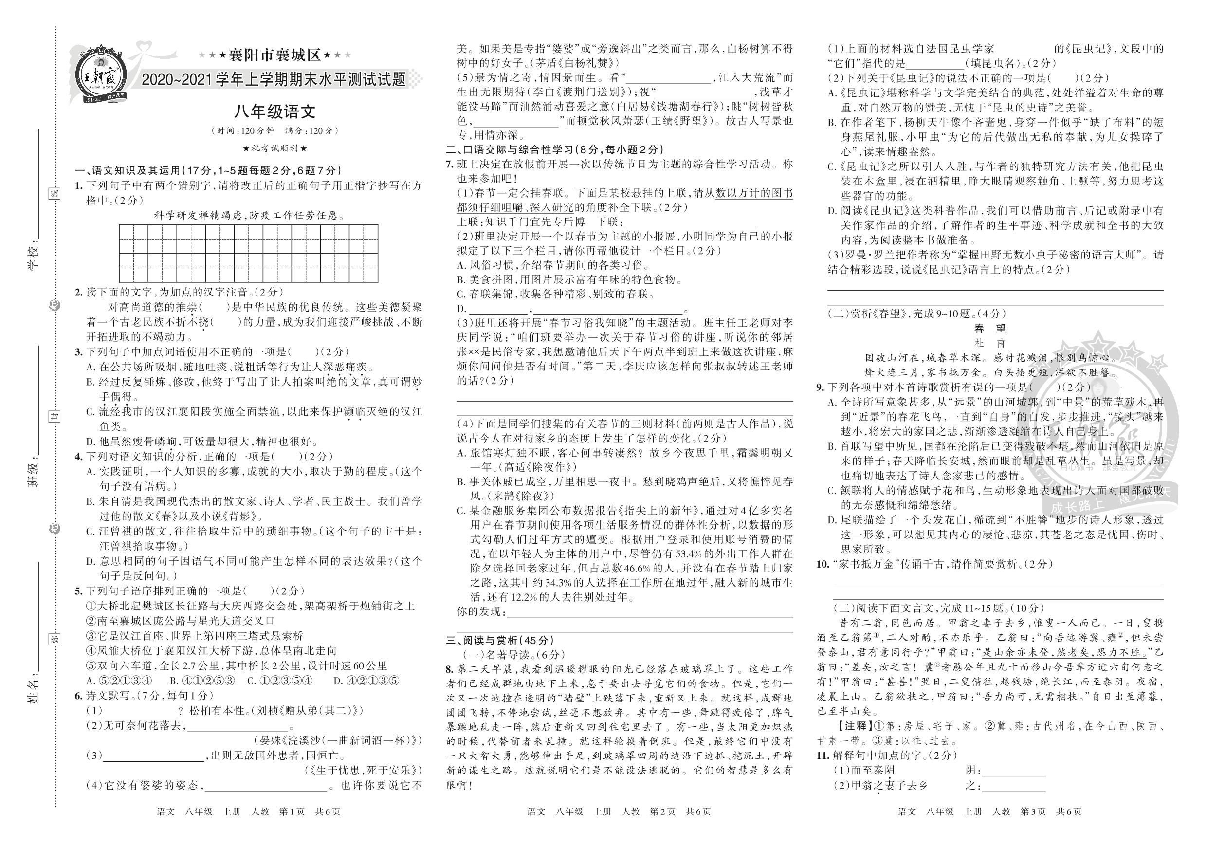 襄阳市襄城区2020~2021学年上学期期末水平测试试题八年级语文(人教版)