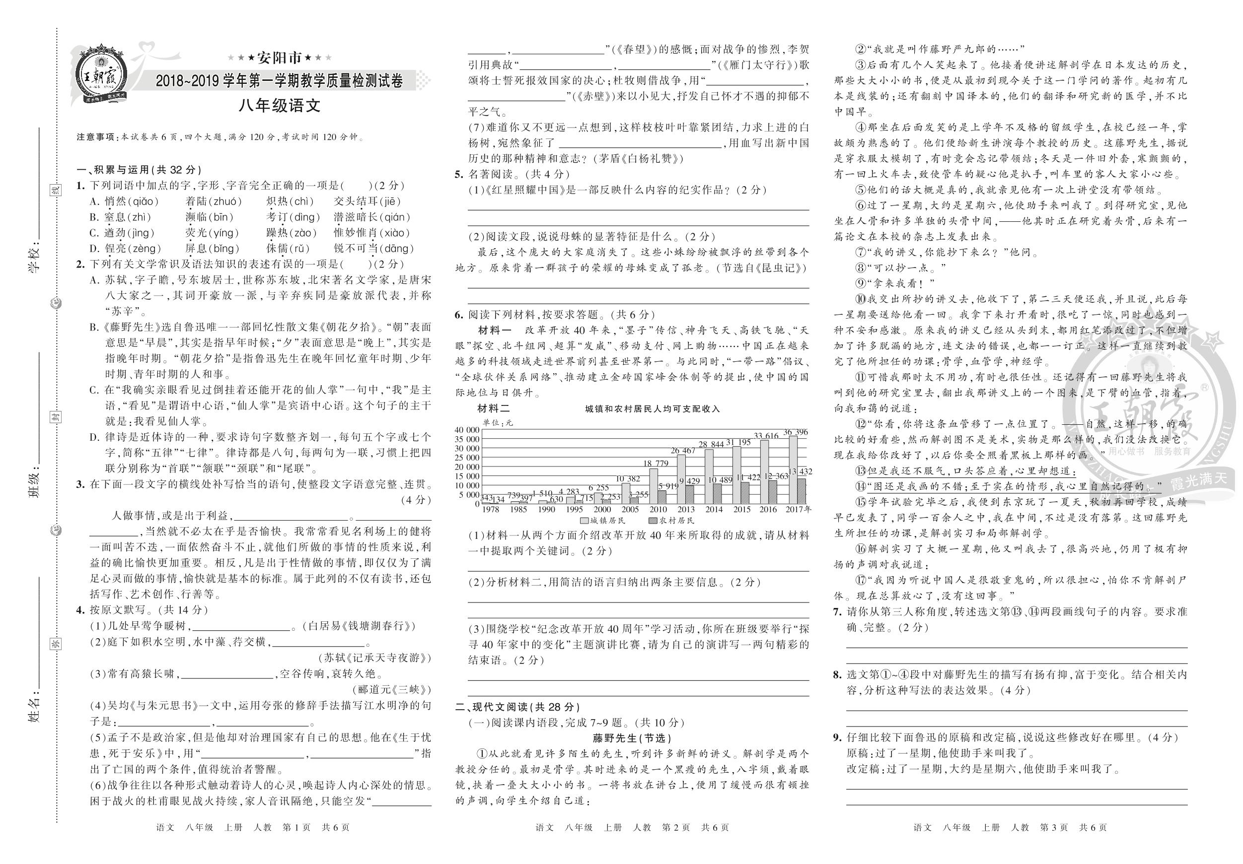 安阳市2018~2019学年第一学期教学质量检测试卷八年级语文(人教版)