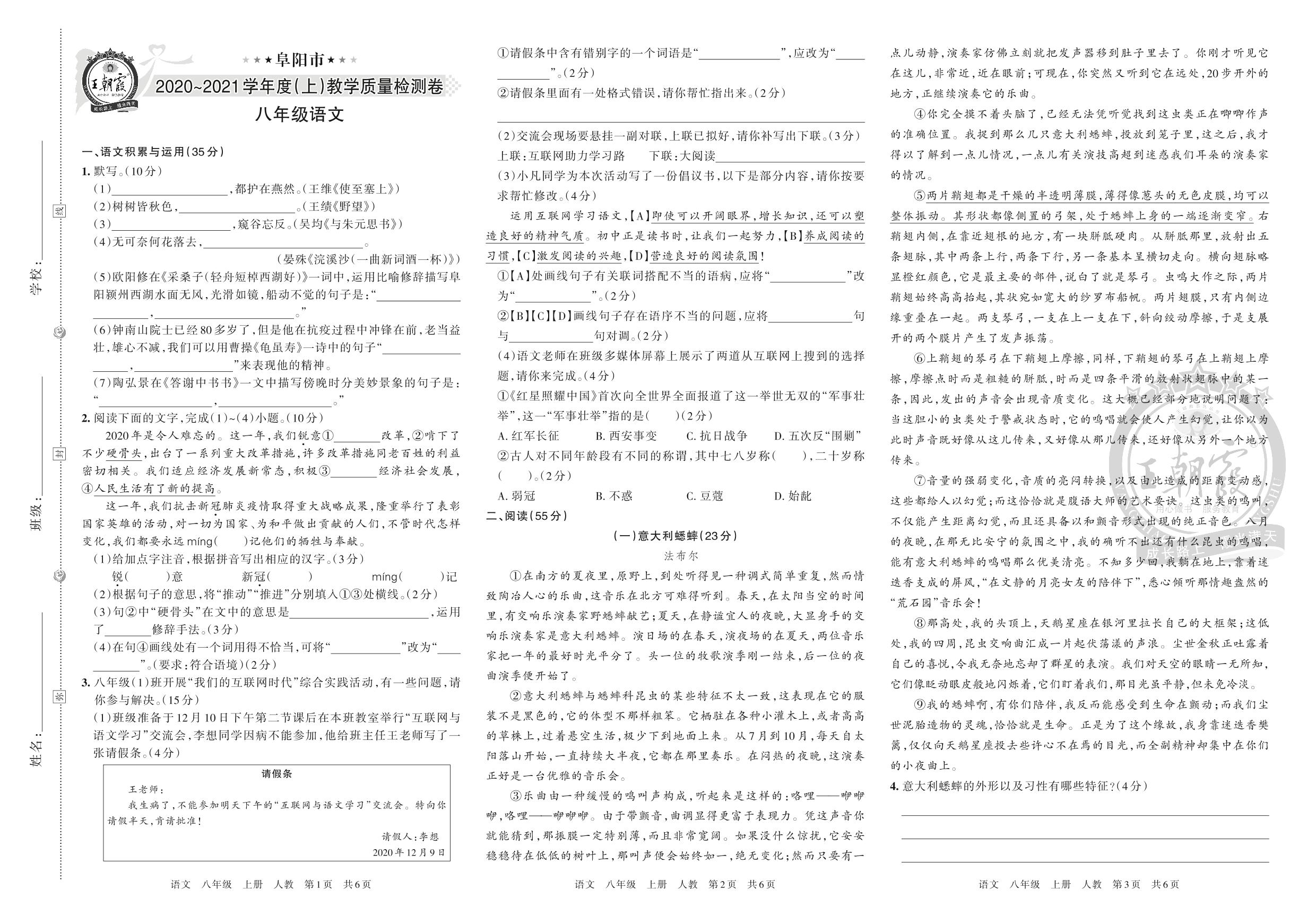 阜阳市2020~2021学年度(上)教学质量检测卷八年级语文(人教版)