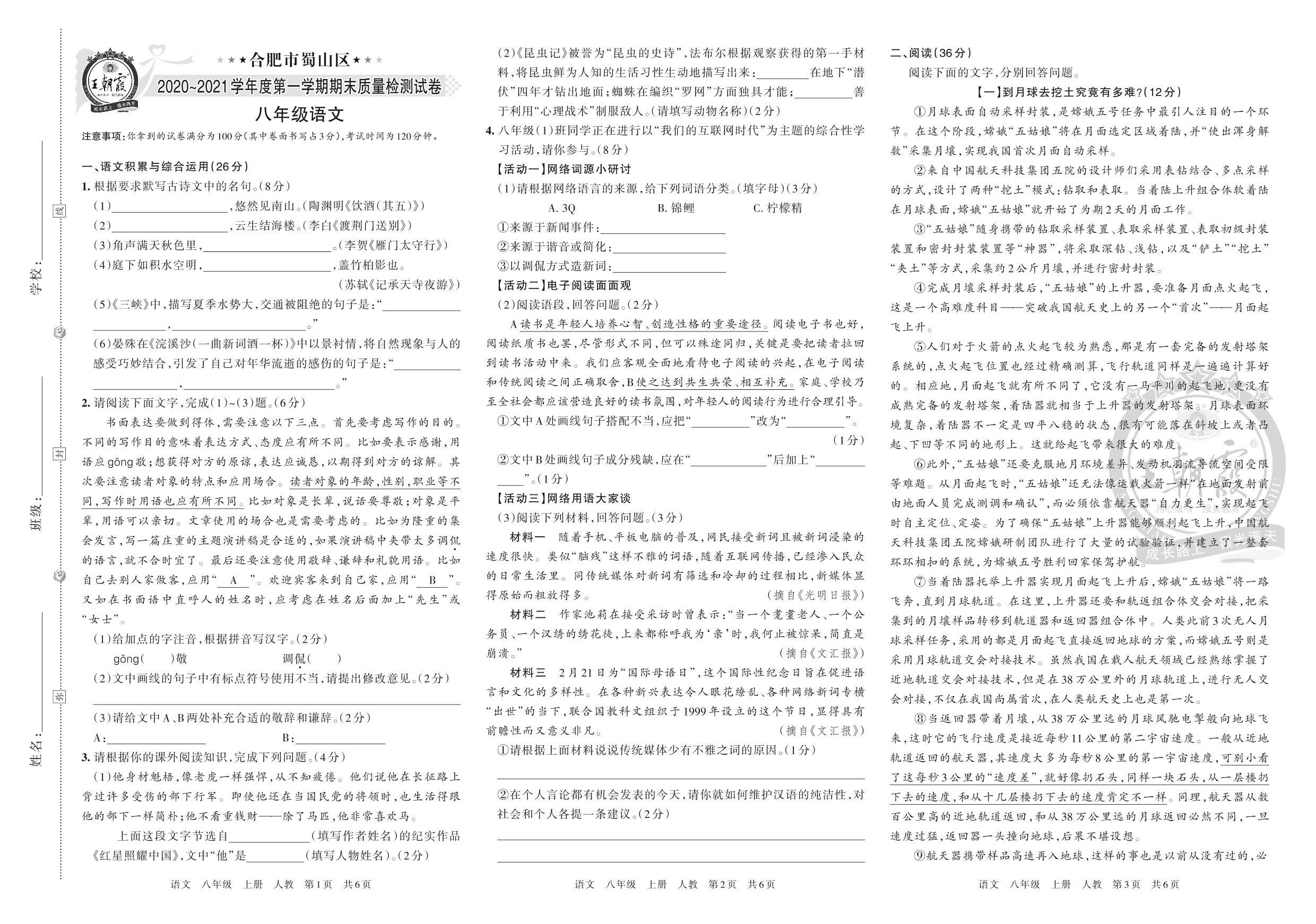 合肥市蜀山区2020~2021学年度第一学期期末质量检测试卷八年级语文(人教版)