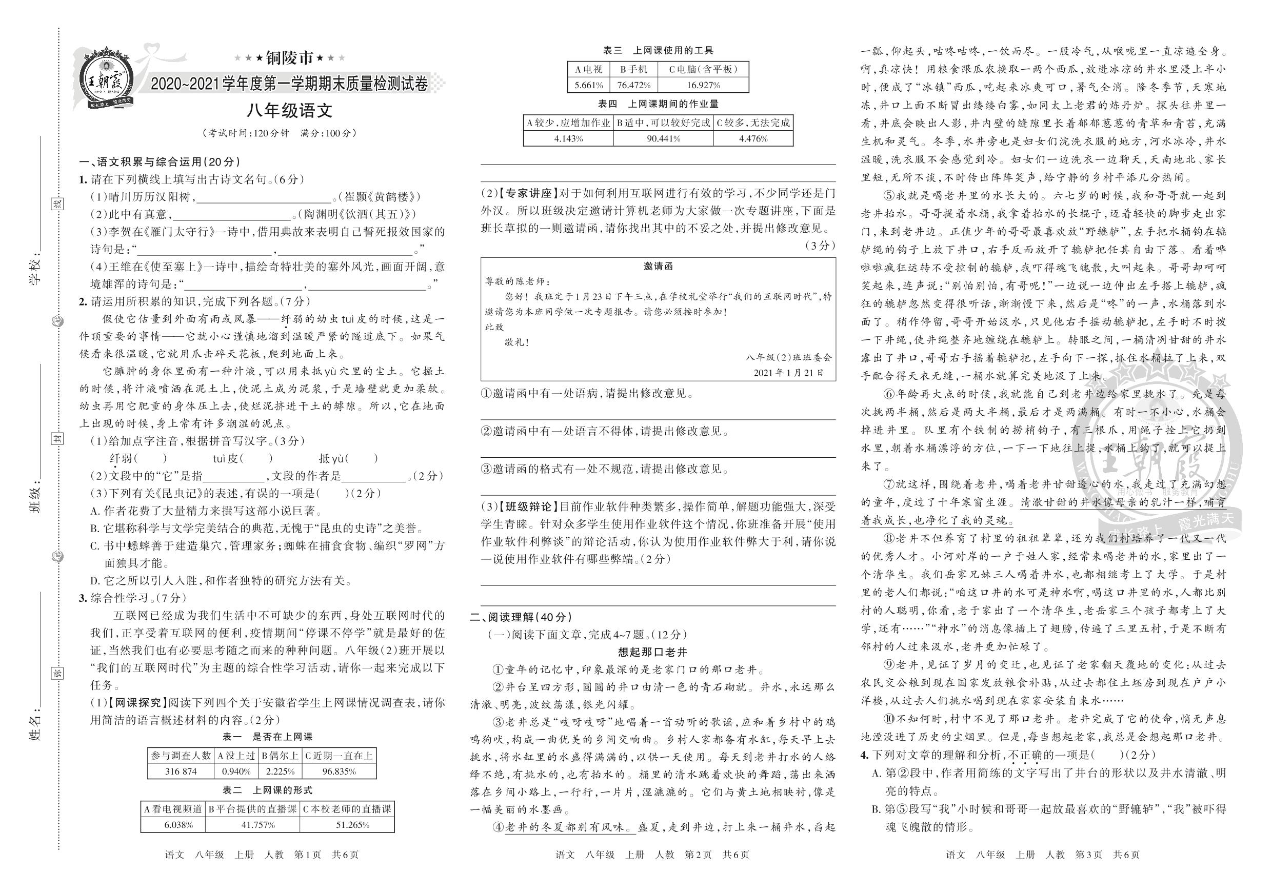 铜陵市2020~2021学年度第一学期期末质量检测试卷八年级语文(人教版)