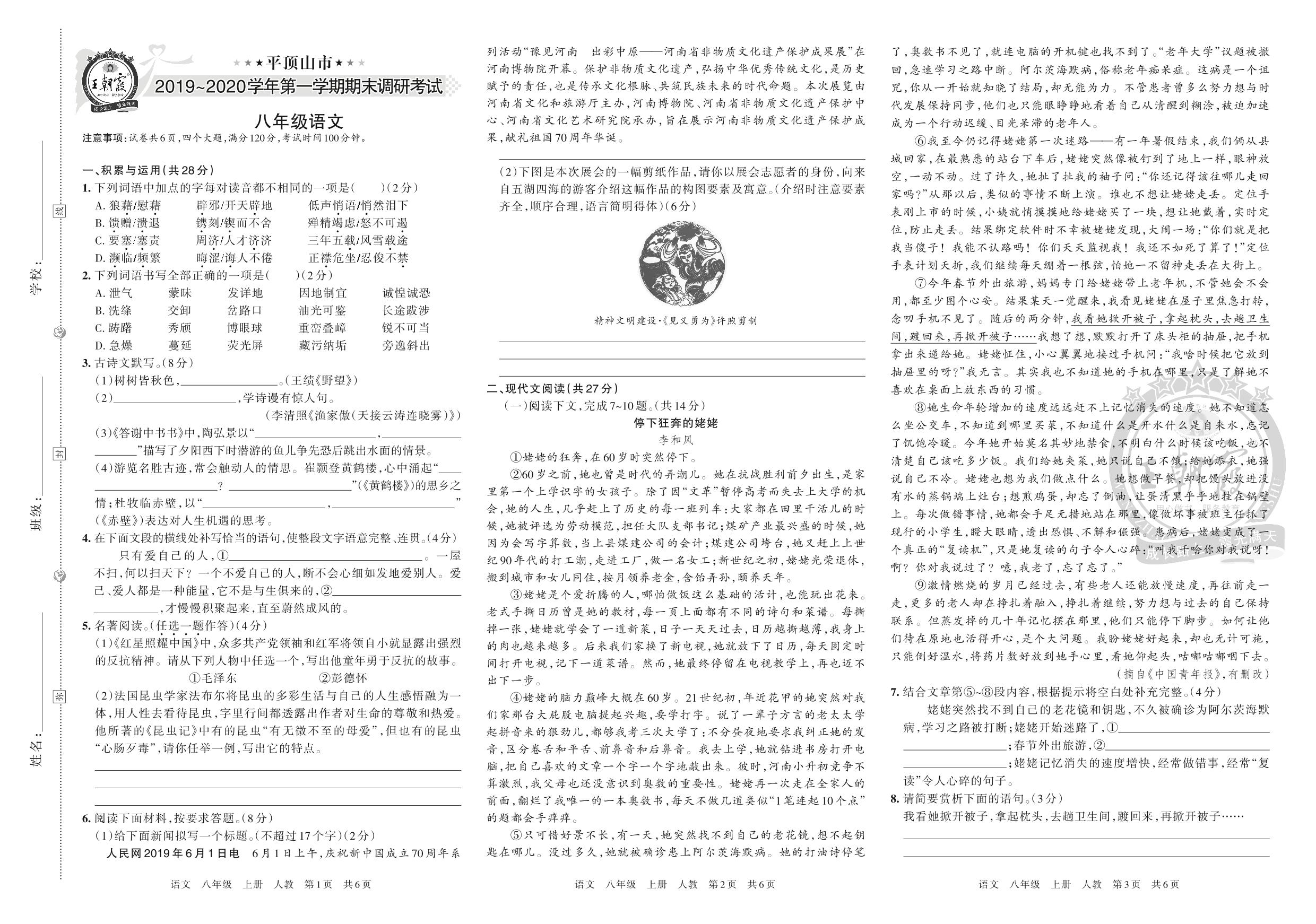 平顶山市2019~2020学年第一学期期末调研考试八年级语文(人教版)