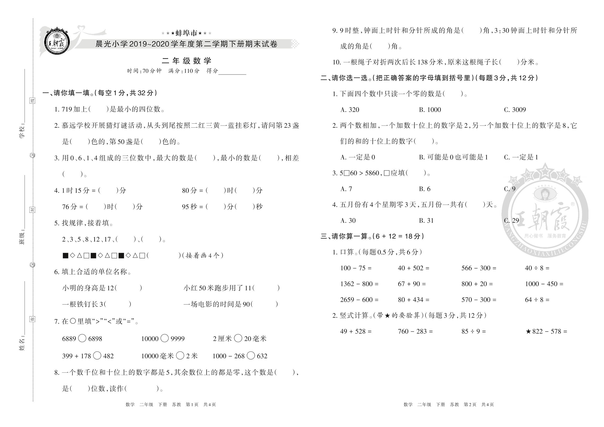 蚌埠市晨光小学2019-2020学年度第二学期下册期末试卷二年级数学(苏教版)