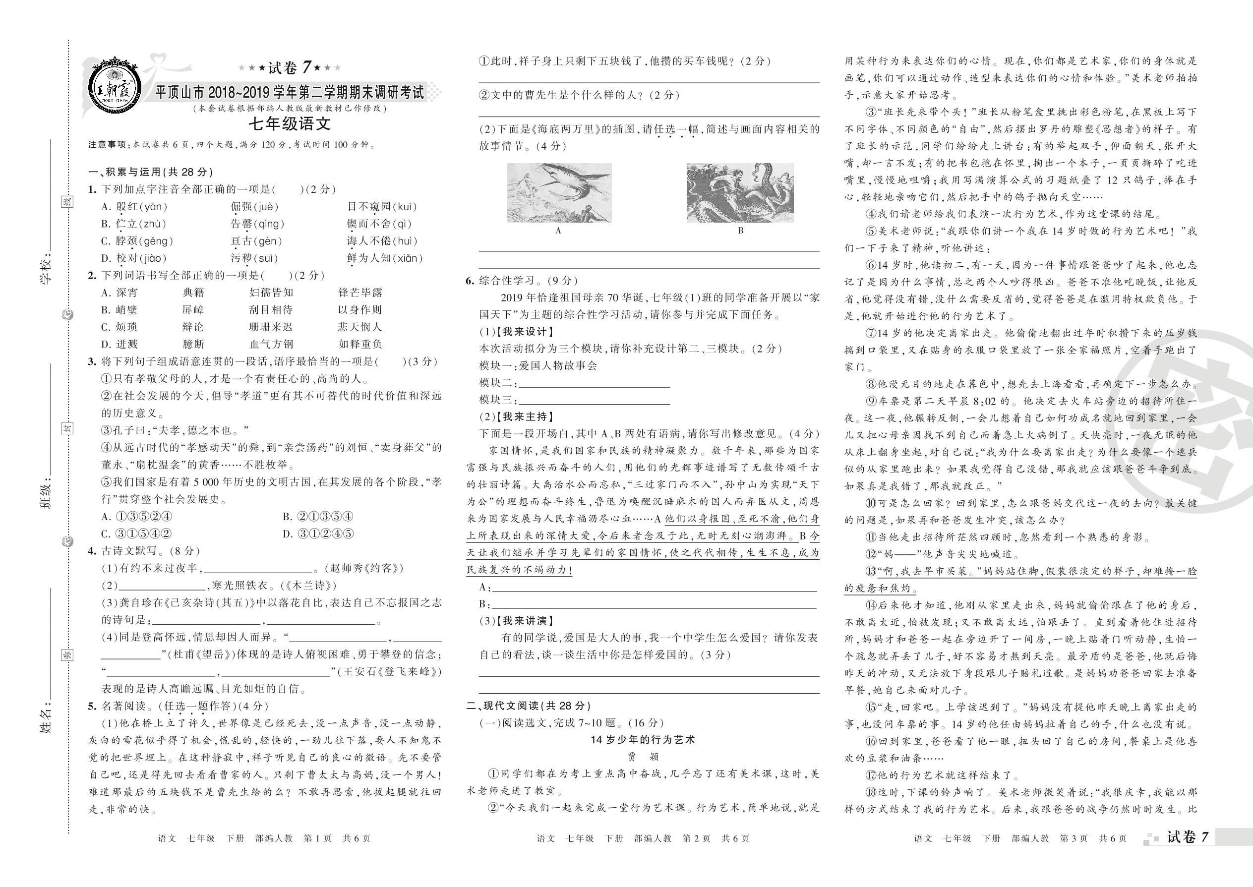 2018-2019学年第二学期平顶山市七年级语文试卷(人教版)【7】