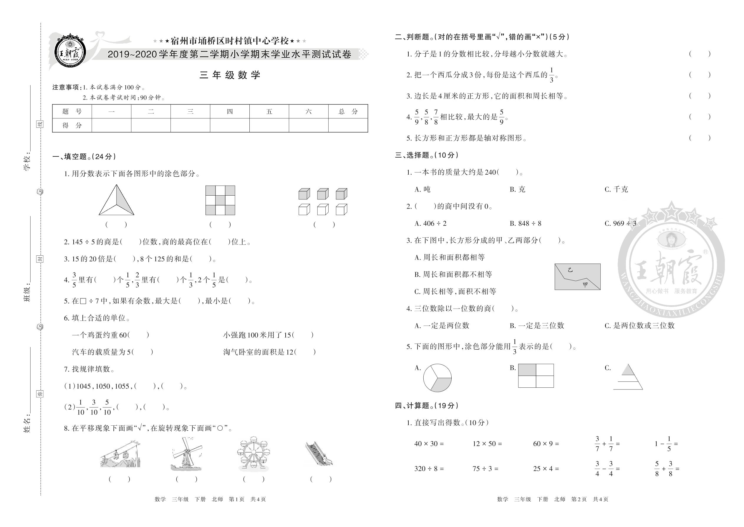 宿州市埇桥区时村镇中心学校2019~2020学年度第二学期小学期末学业水平测试试卷三年级数学(北师版)