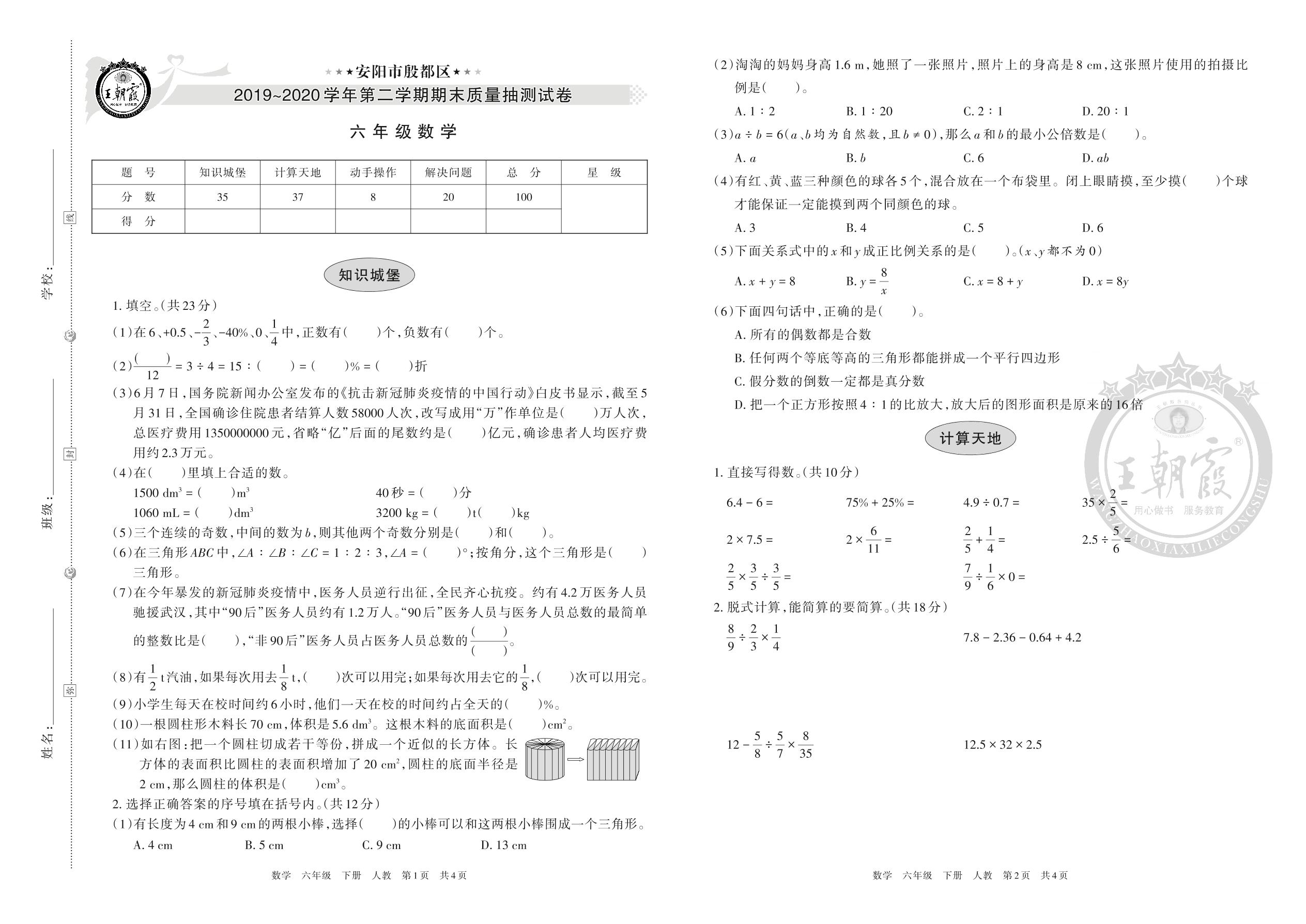 安阳市殷都区2019~2020学年第二学期期末质量抽测试卷六年级数学(人教版)