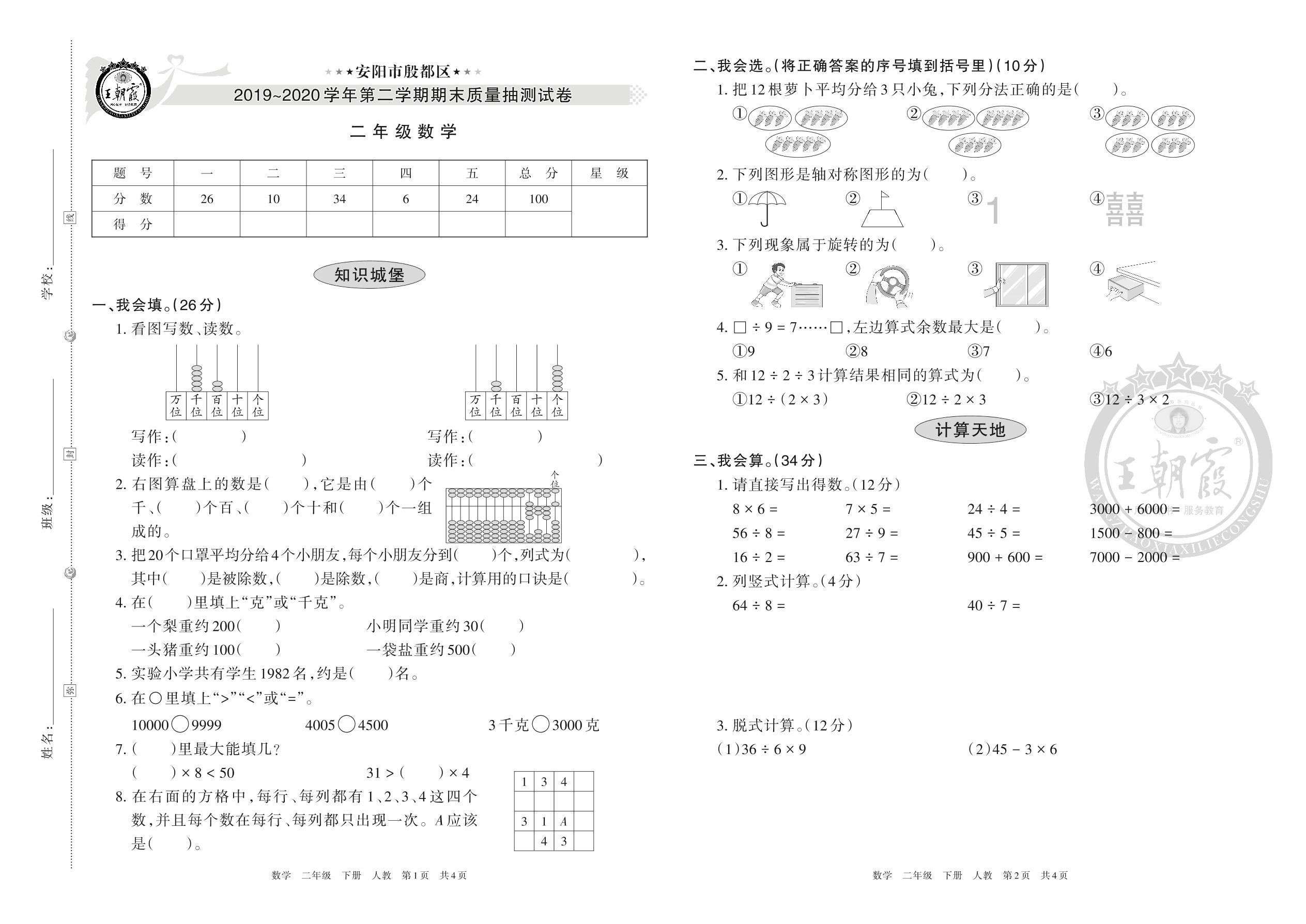 安阳市殷都区2019~2020学年第二学期期末质量抽测试卷二年级数学(人教版)