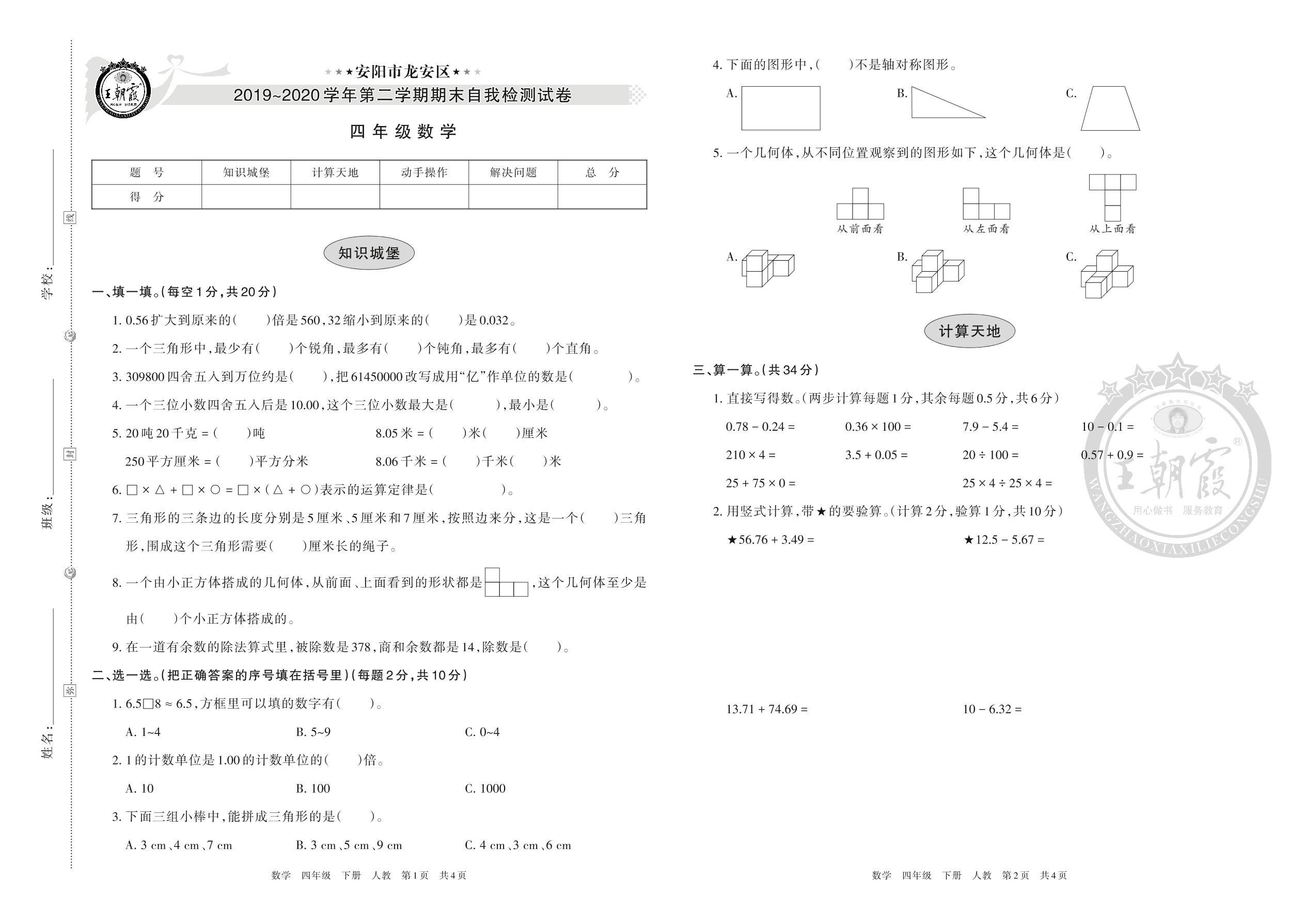 安阳市龙安区2019~2020学年第二学期期末自我检测试卷四年级数学(人教版)