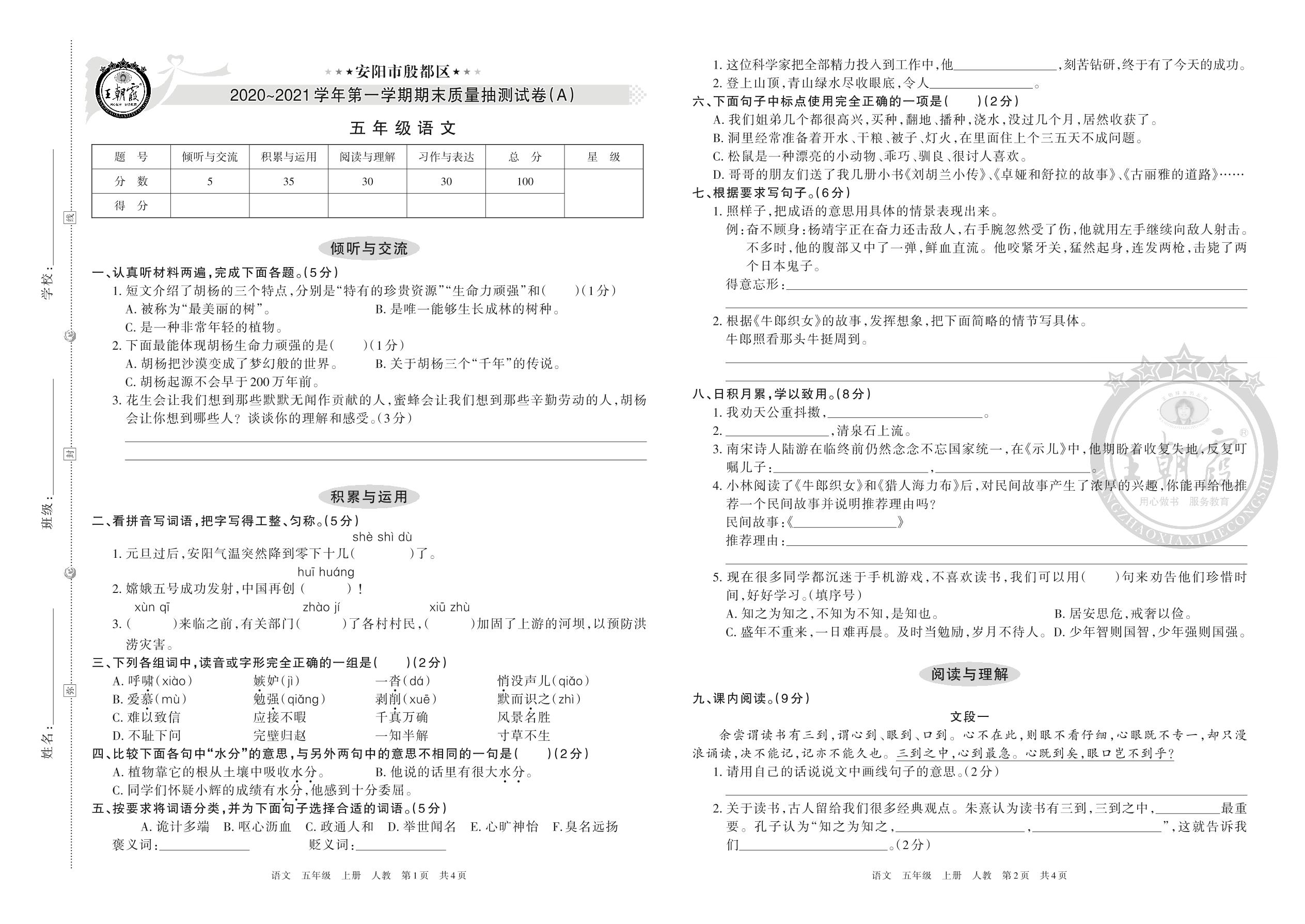 安阳市股都区2020-2021学年第一学期期末质量抽测试卷(A)五年级语文(人教版)