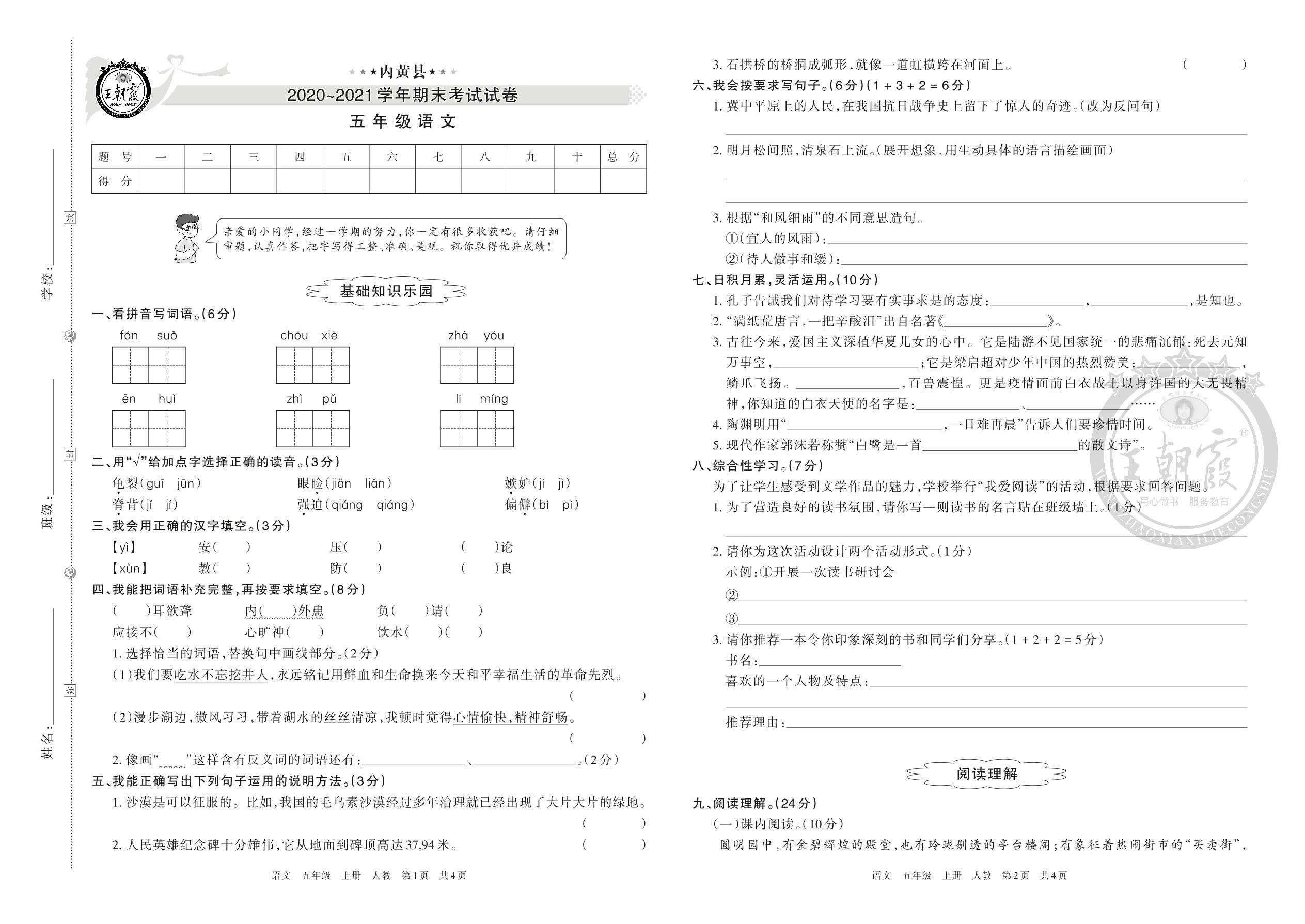 内黄县2020-2021学年期末考试试卷五年级语文(人教版)