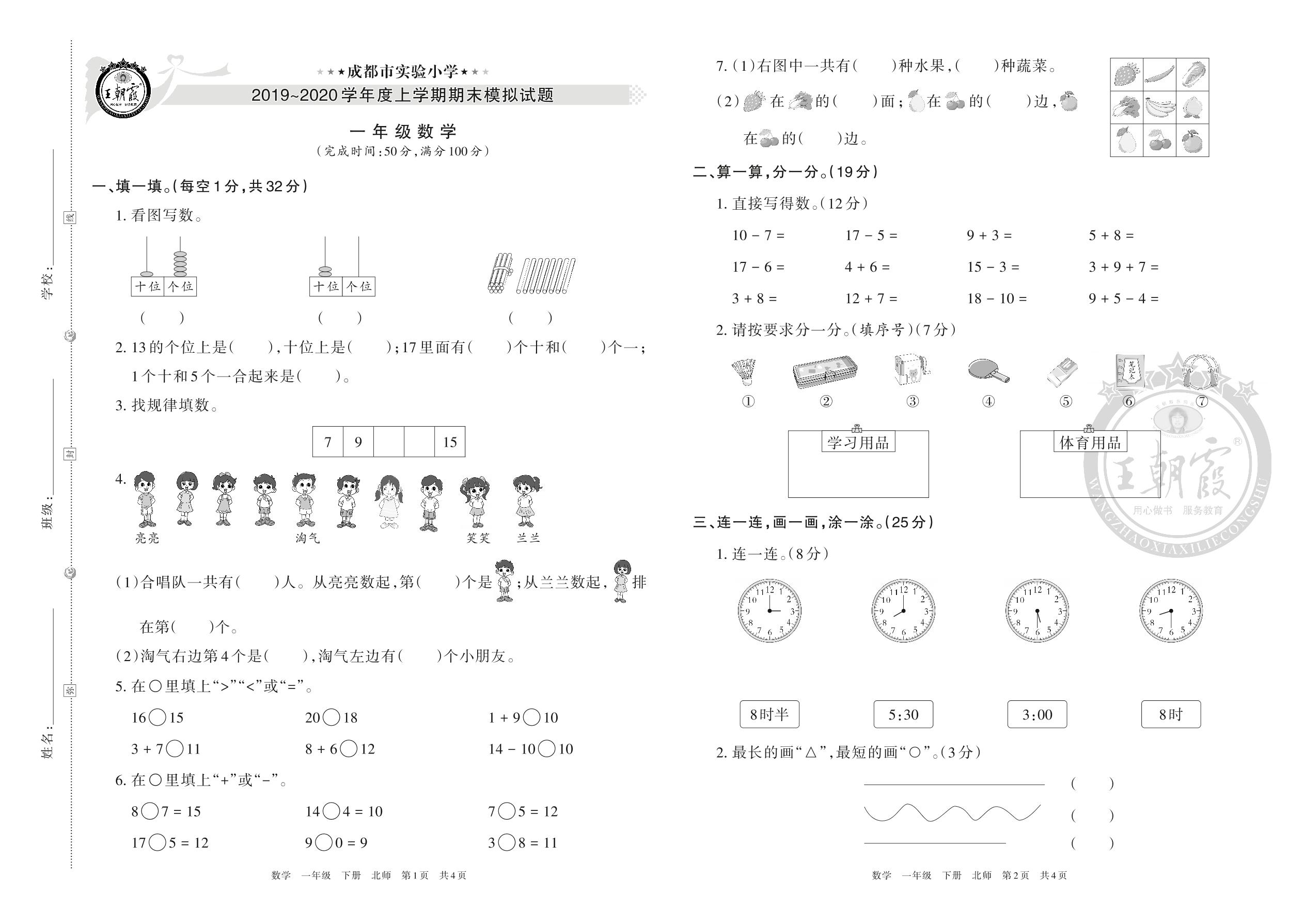 成都市实验小学2019~2020学年度上学期期末模拟试题一年级数学(北师版)