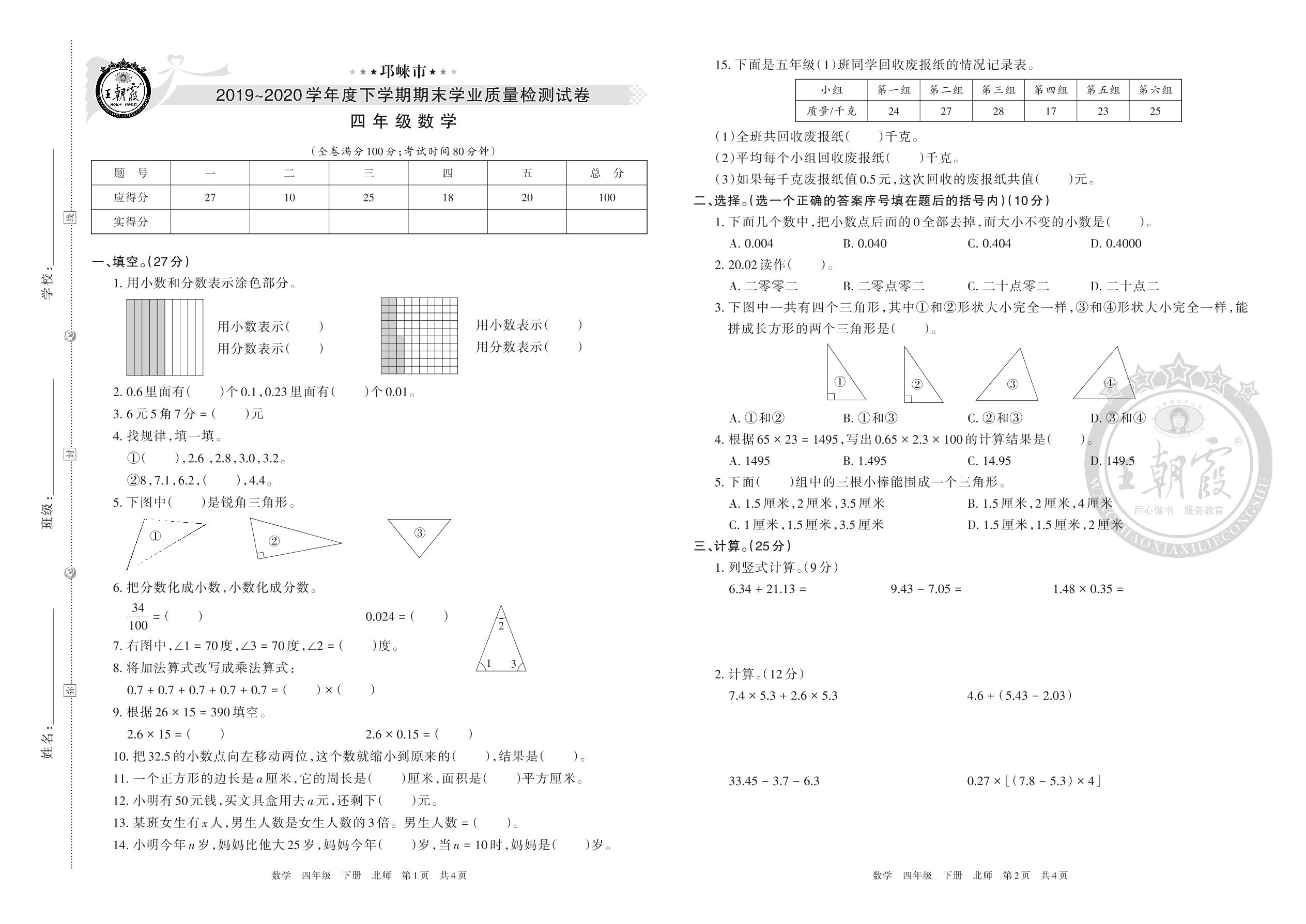 邛崃市2019~2020学年度下学期期末学业质量检测试卷四年级数学(北师版)