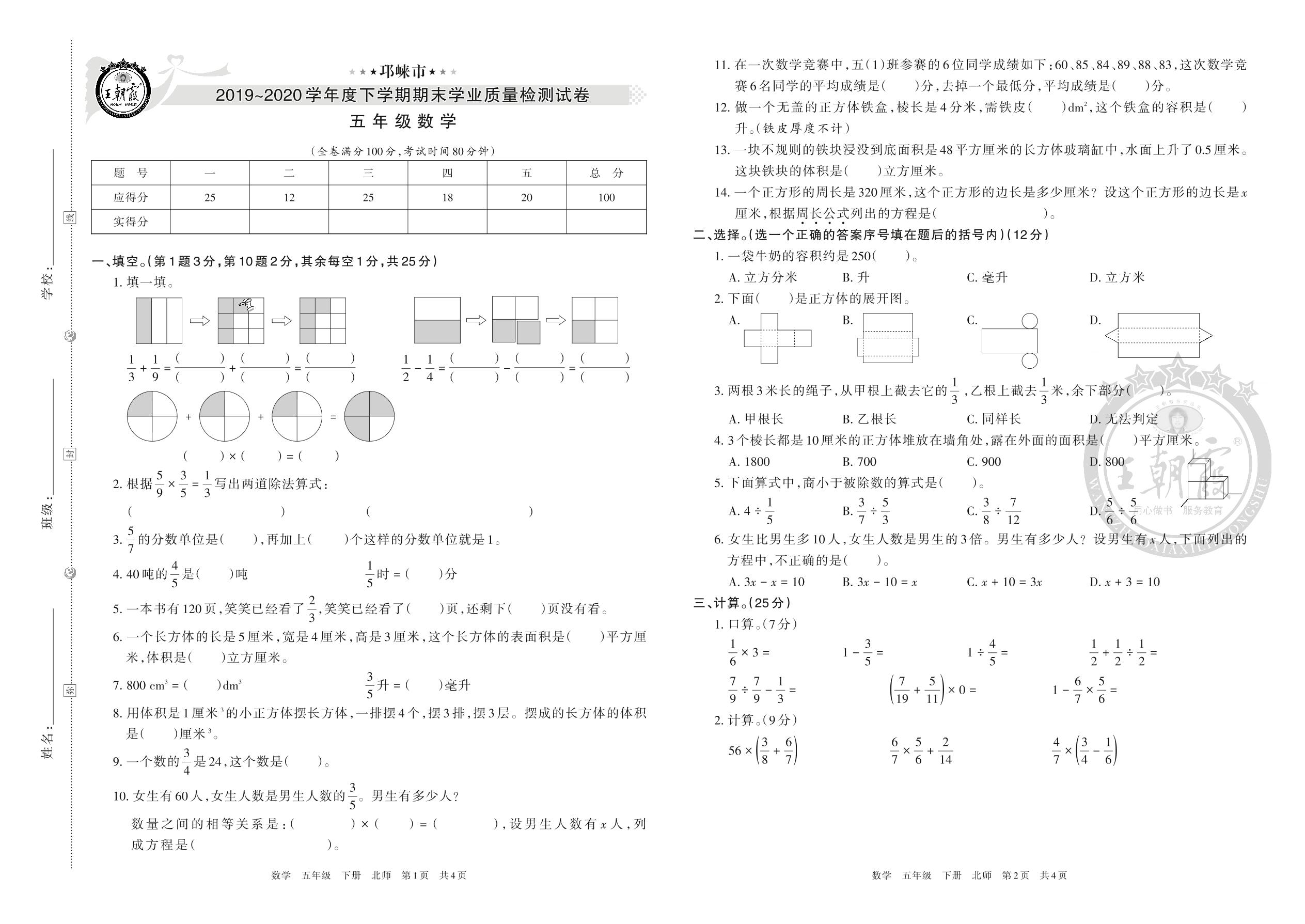 邛崃市2019~2020学年度下学期期末学业质量检测试卷五年级数学(北师版)