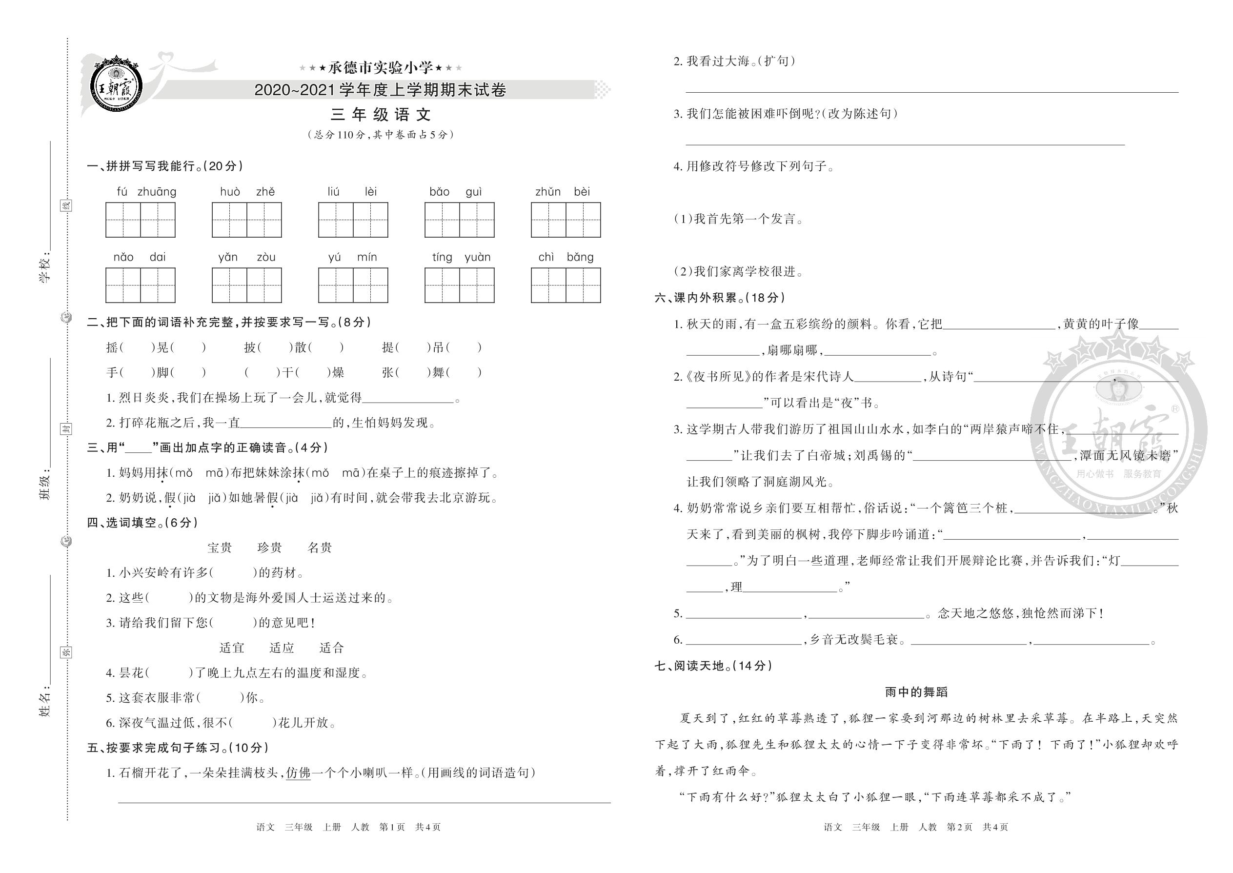 承德市实验小学2020-2021学年度上学期期末试卷三年级语文(人教版)