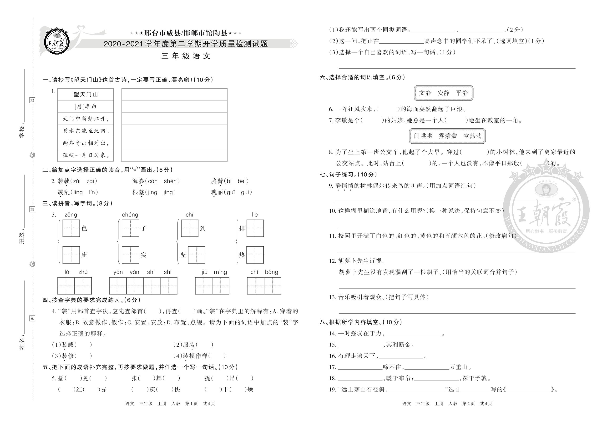 邢台市威县、邯郸市馆陶县2020-2021学年度第二学期开学质量检测试题三年级语文(人教版)