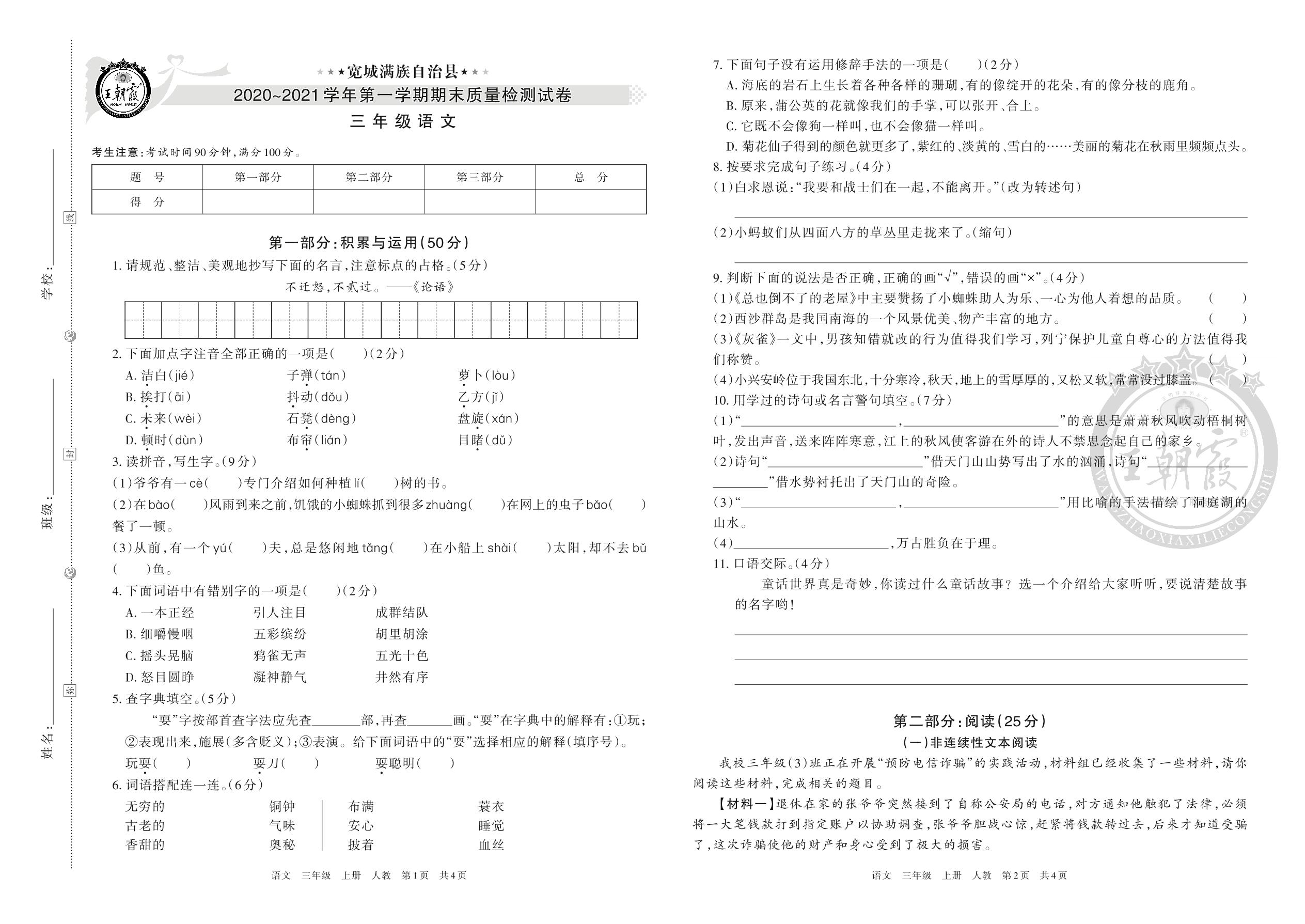 宽城满族自治县2020-2021学年第一学期期末质量检测试卷三年级语文(人教版)