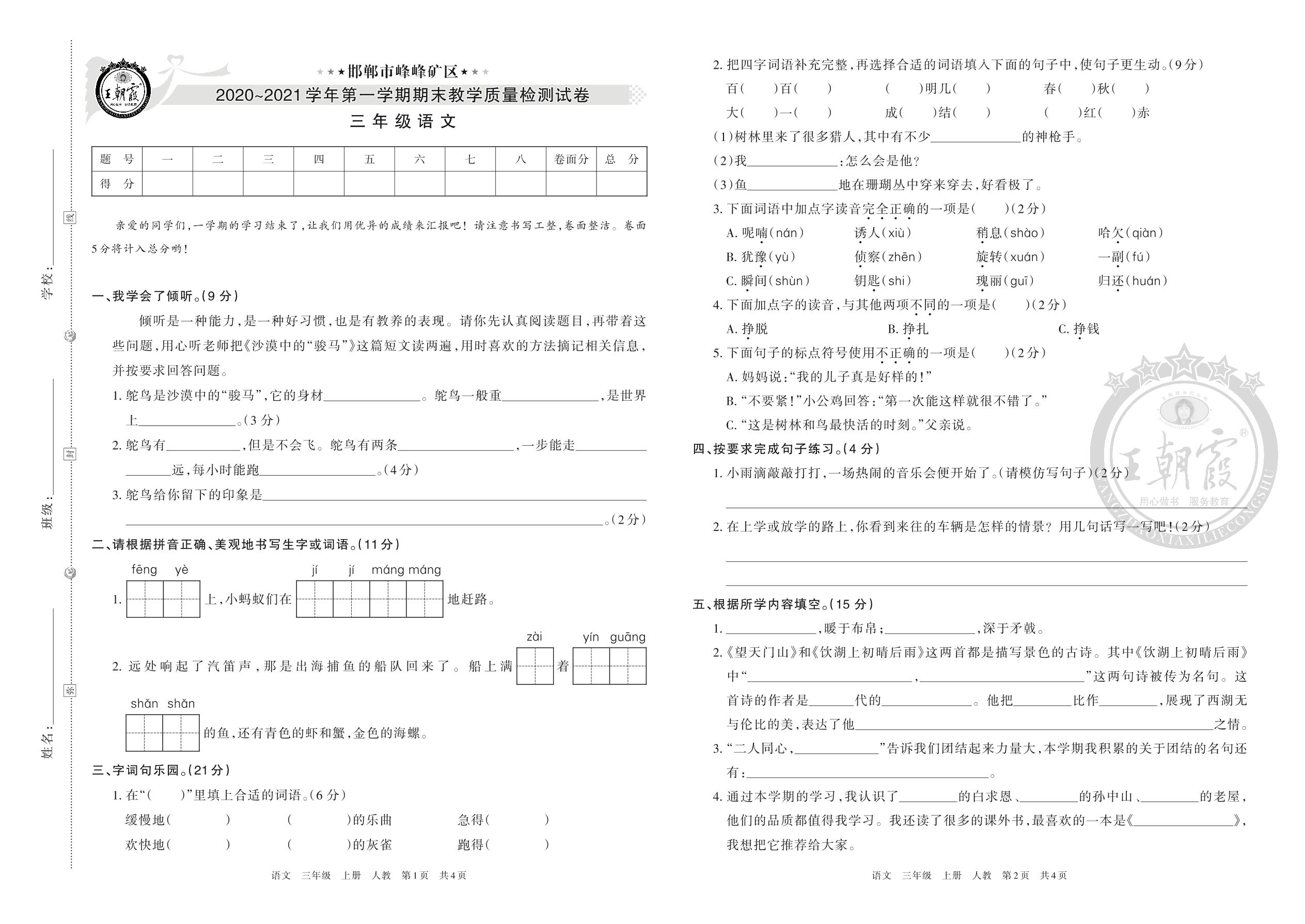 邯郸市峰峰矿区2020-2021学年第一学期期末教学质量检测试卷三年级语文(人教版)