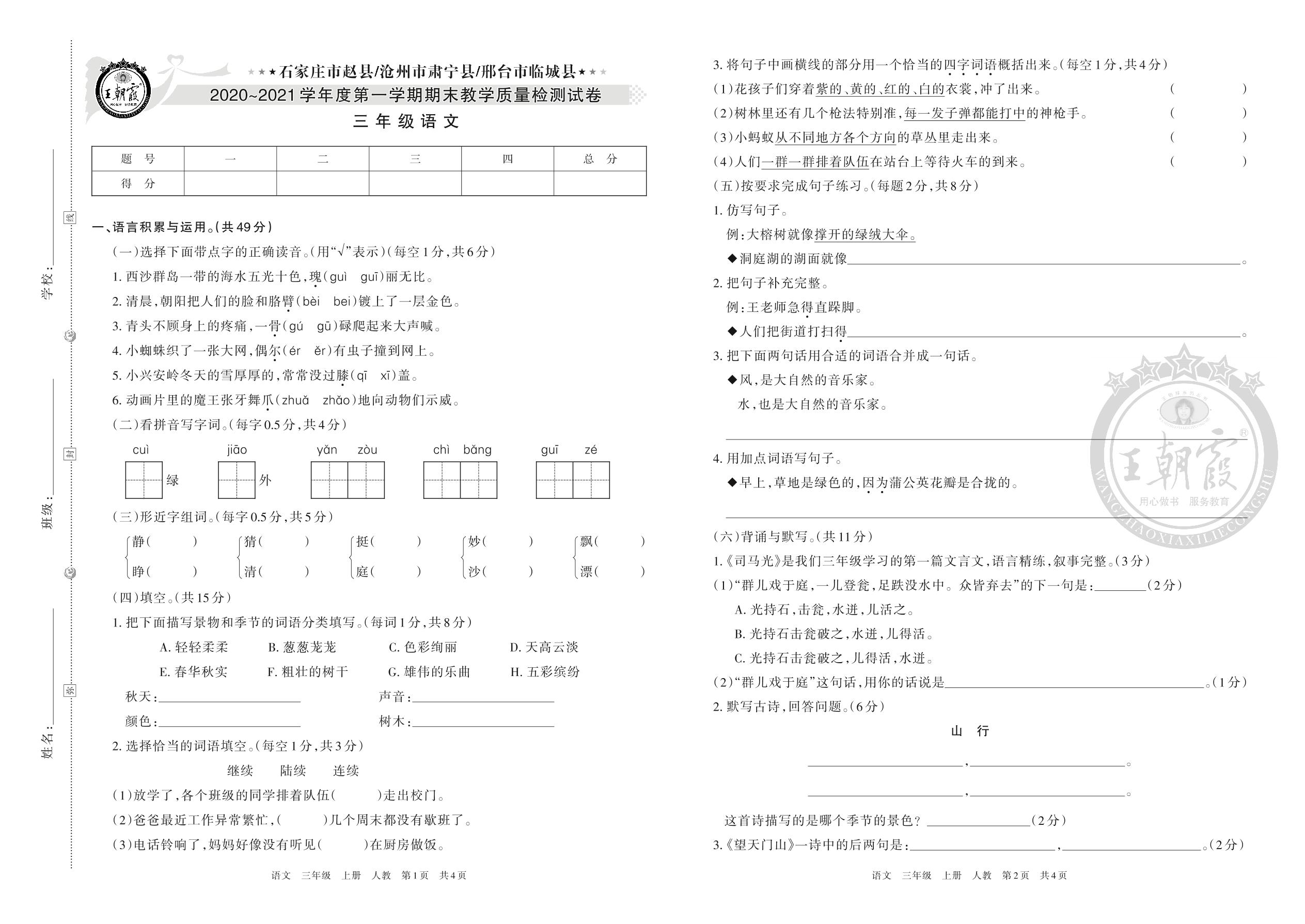 石家庄赵县、沧州市肃宁县、邢台市临城县2020-2021学年度第一学期期末教学质量检测试卷三年级语文(人教版)
