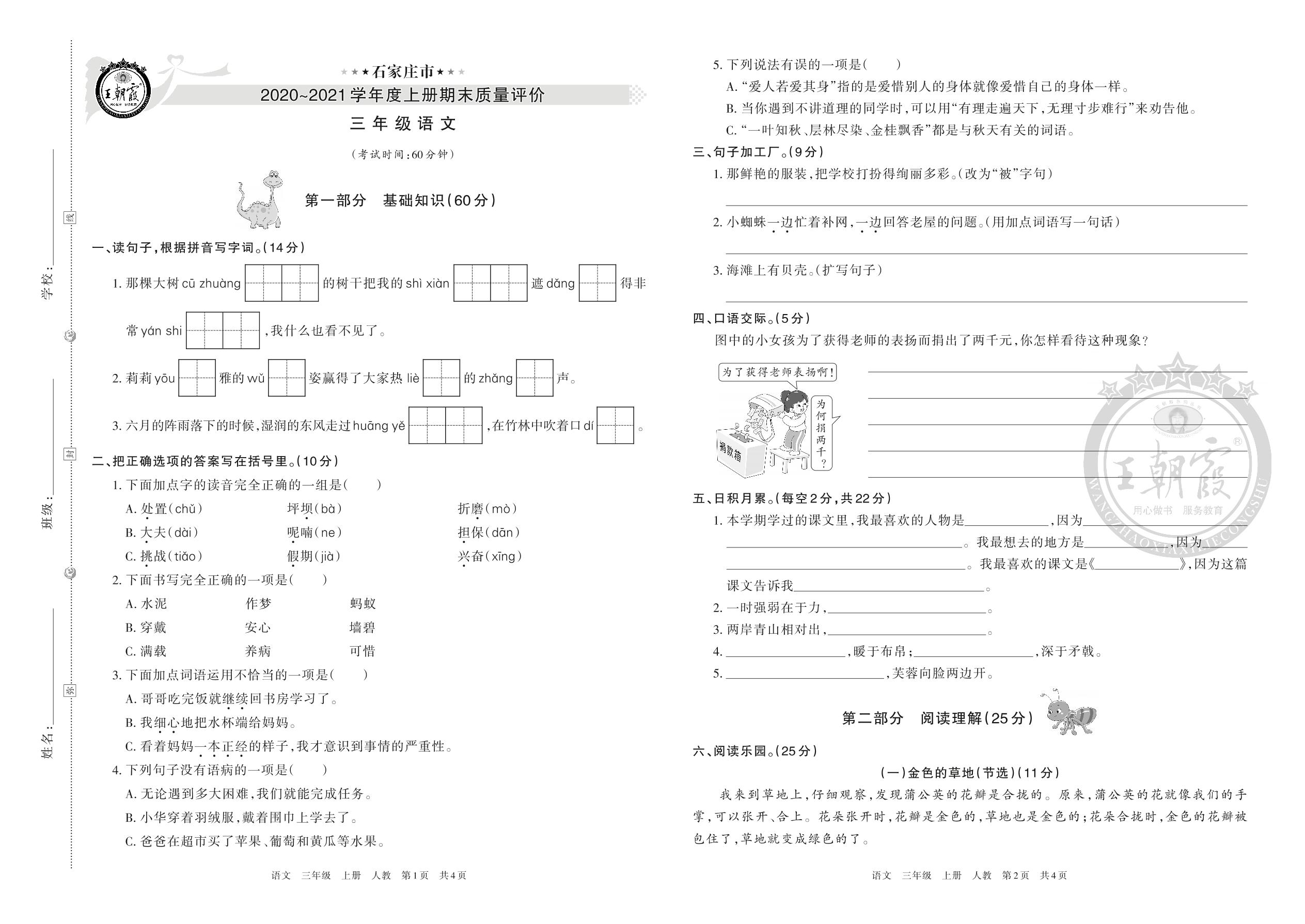 石家庄市2020-2021学年度上册期末质量评价三年级语文(人教版)