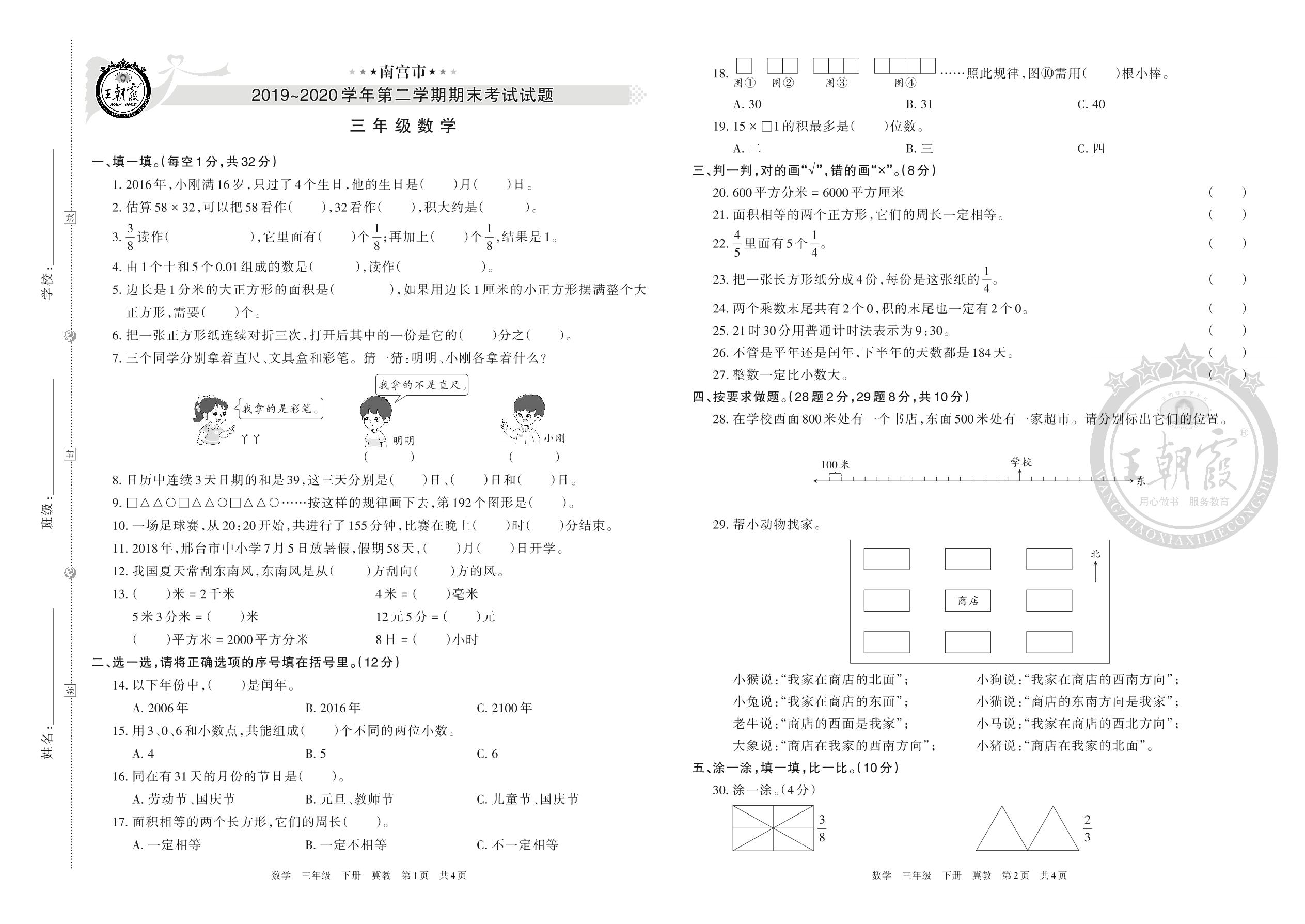 南宫市2019-2020学年第二学期期末考试试题三年级数学(冀教版)