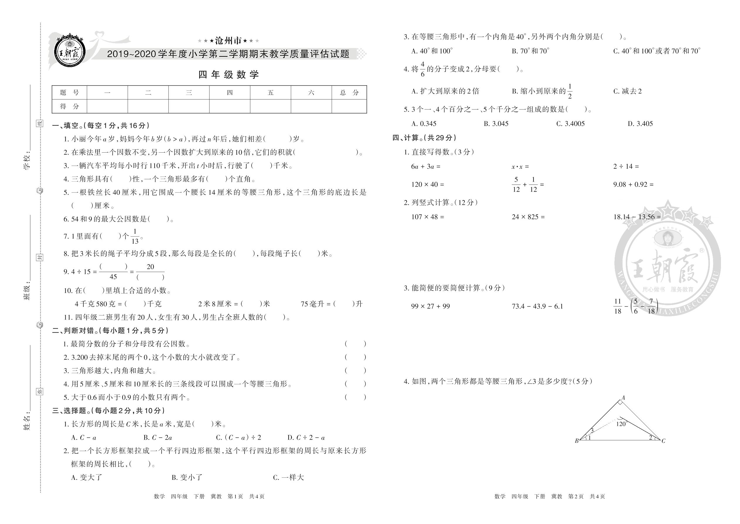 沧州市2019-2020学年度小学第二学期期末教学质量评估试题四年级数学(冀教版)