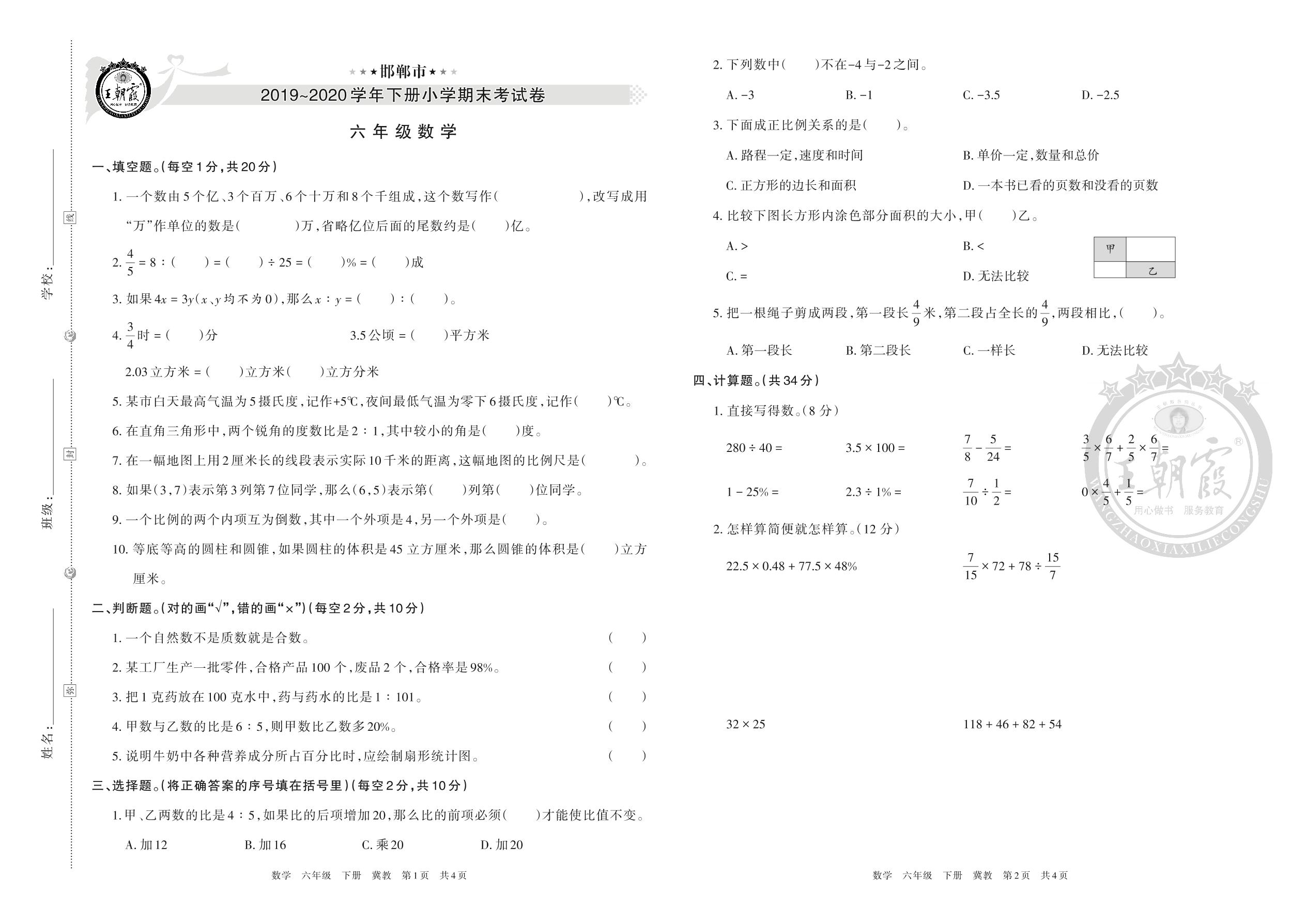 邯郸市2019~2020学年下册小学期末考试卷六年级数学(冀教版)