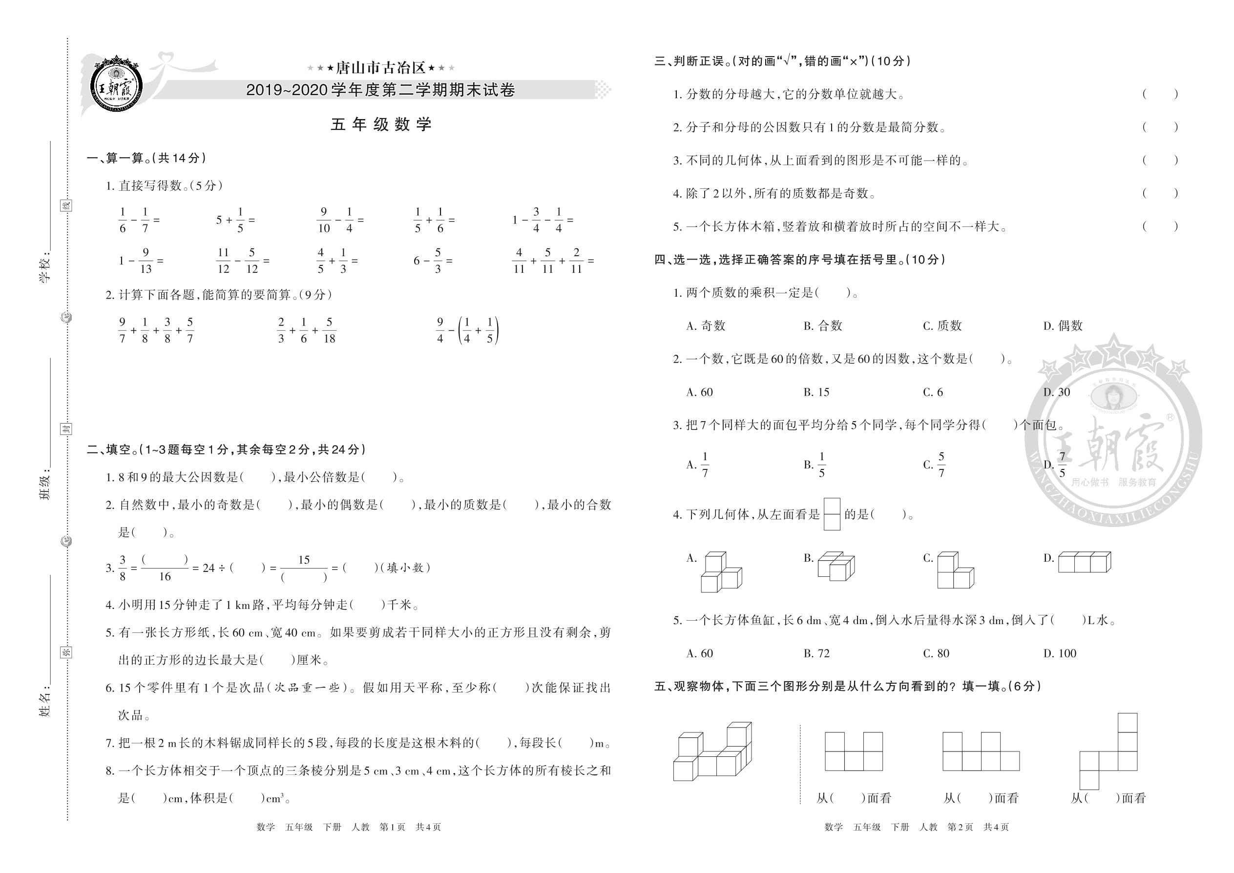 唐山市古冶区2019~2020学年度第二学期期末试卷五年级数学(人教版)