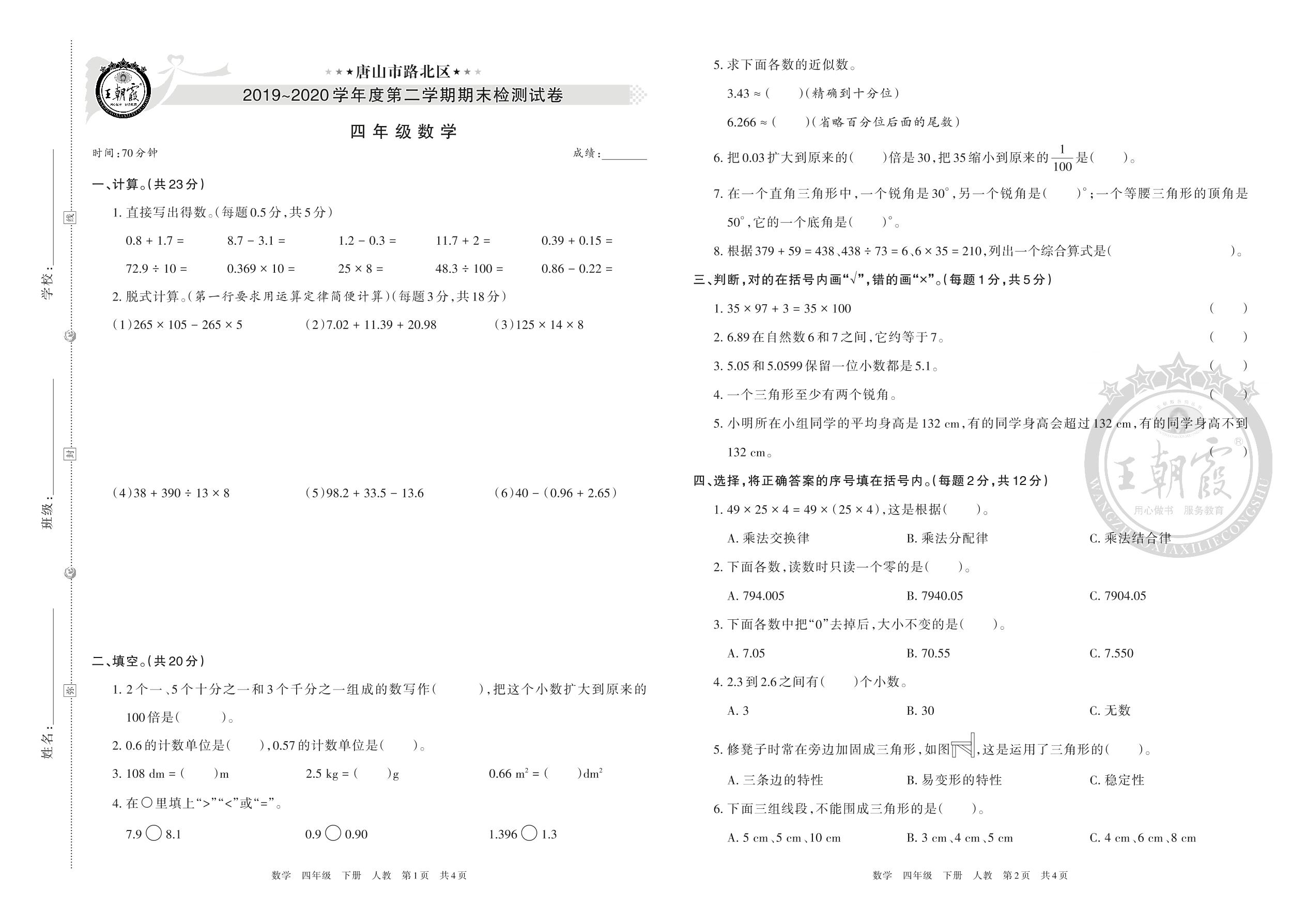 唐山市路北区2019~2020学年度第二学期期末检测试卷四年级数学(人教版)