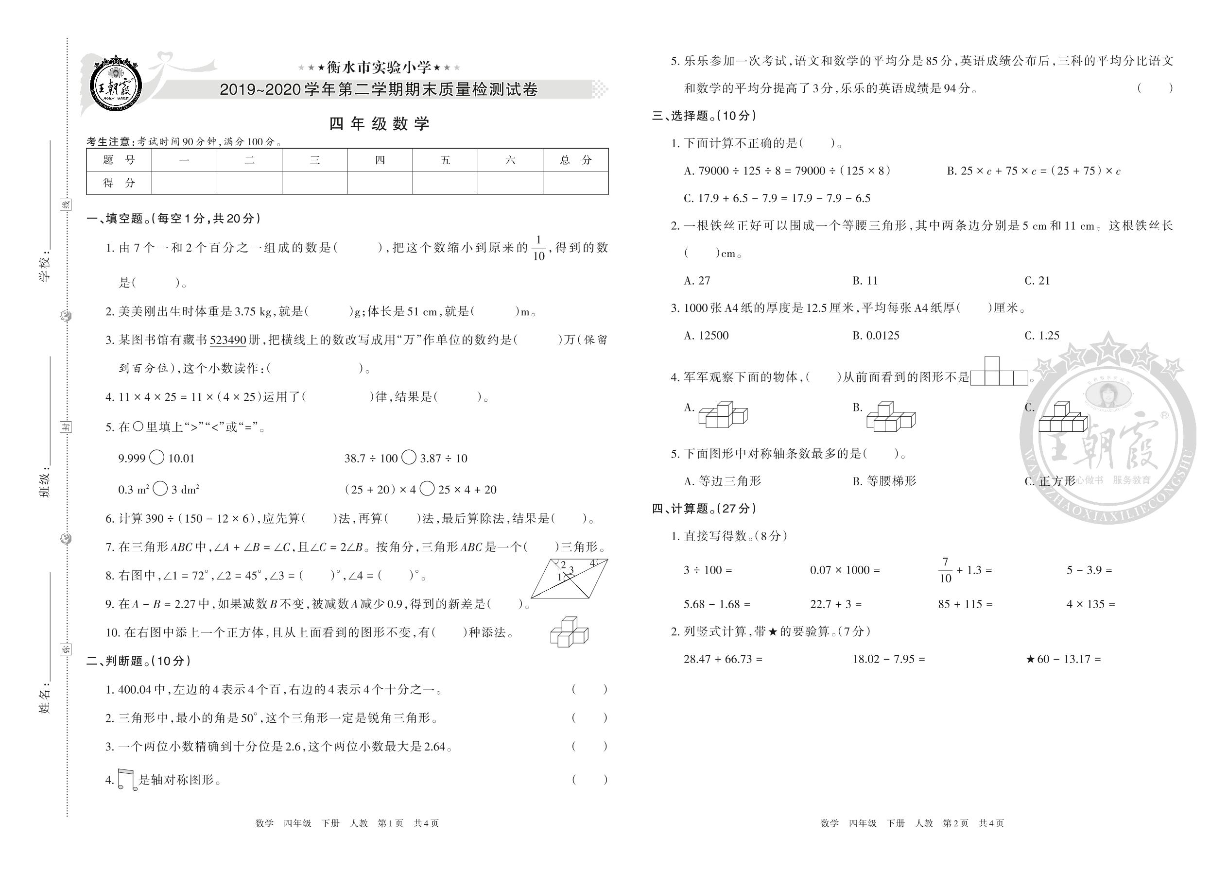 衡水市实验小学2019~2020学年第二学期期末质量检测试卷四年级数学(人教版)
