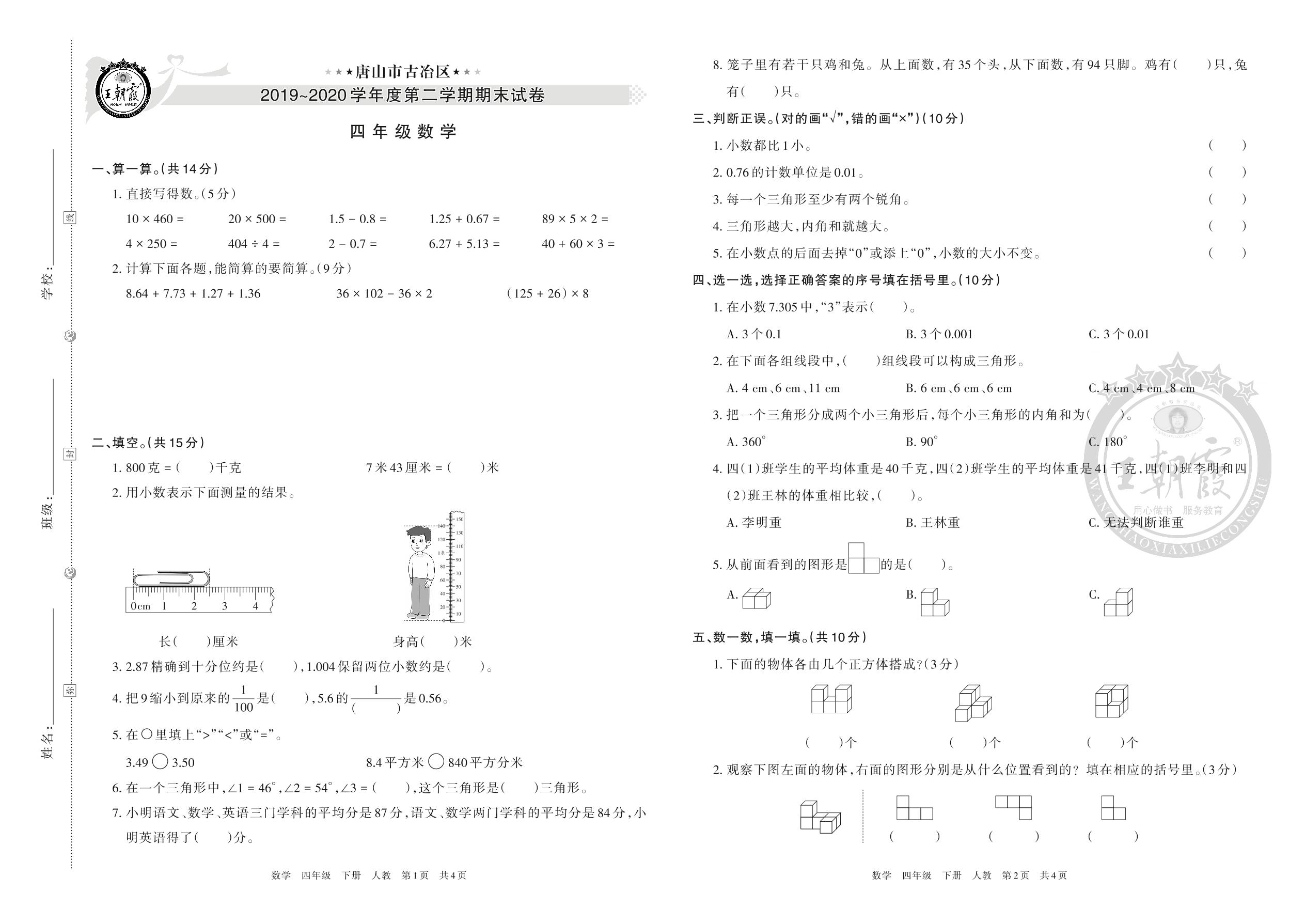 唐山市古冶区2019~2020学年度第二学期期末试卷四年级数学(人教版)