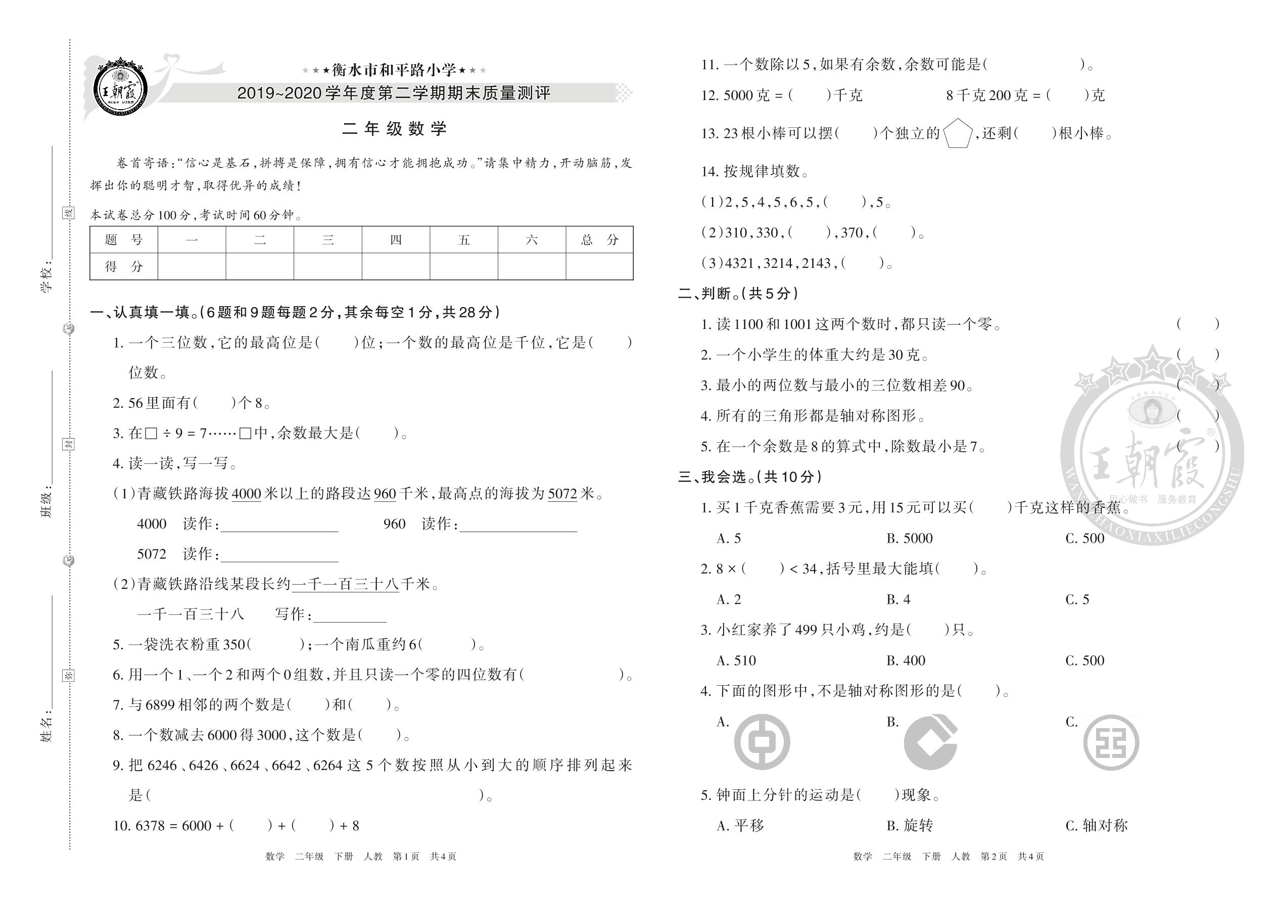 衡水市和平路小学2019~2020学年度第二学期期末质量测评二年级数学(人教版)
