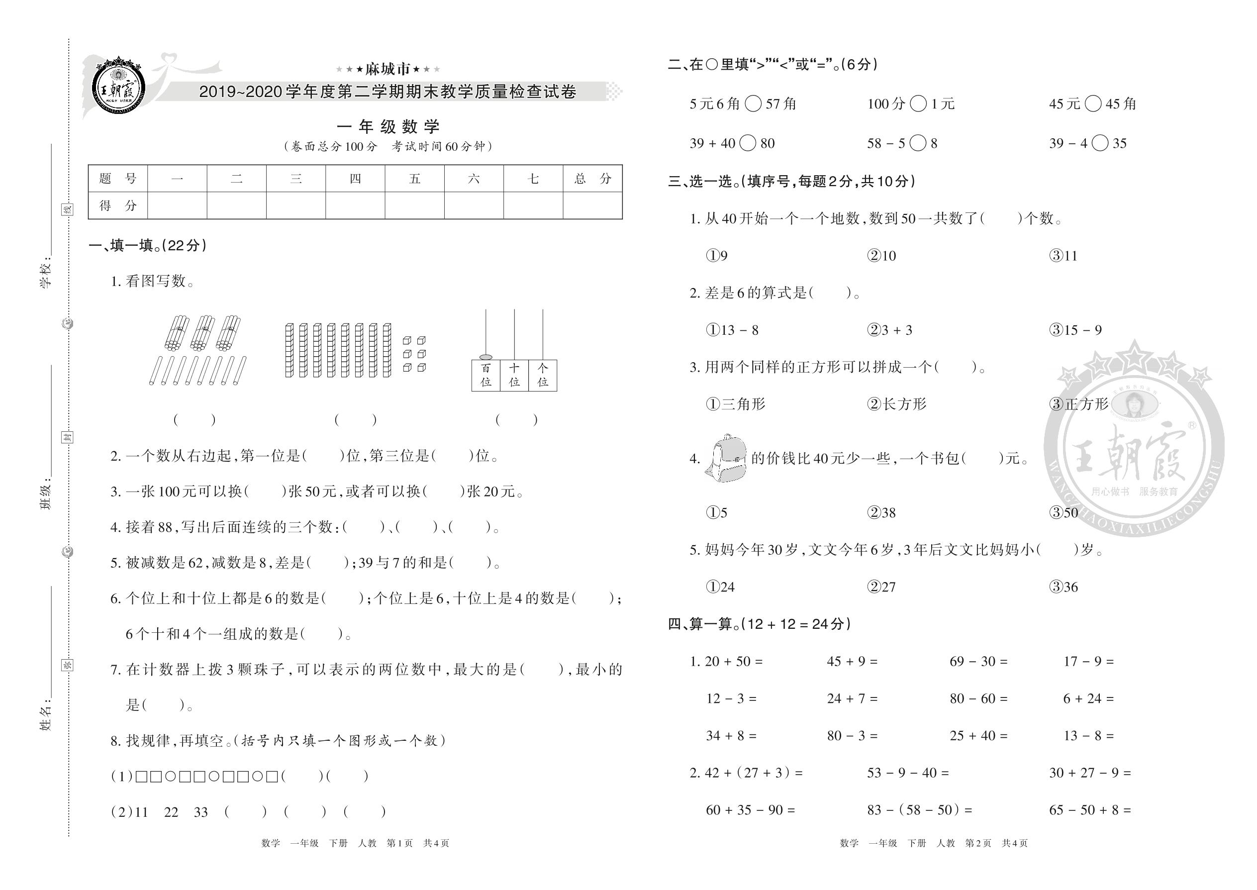 麻城市2019~2020学年度第二学期期末教学质量检查试卷一年级数学(人教版)