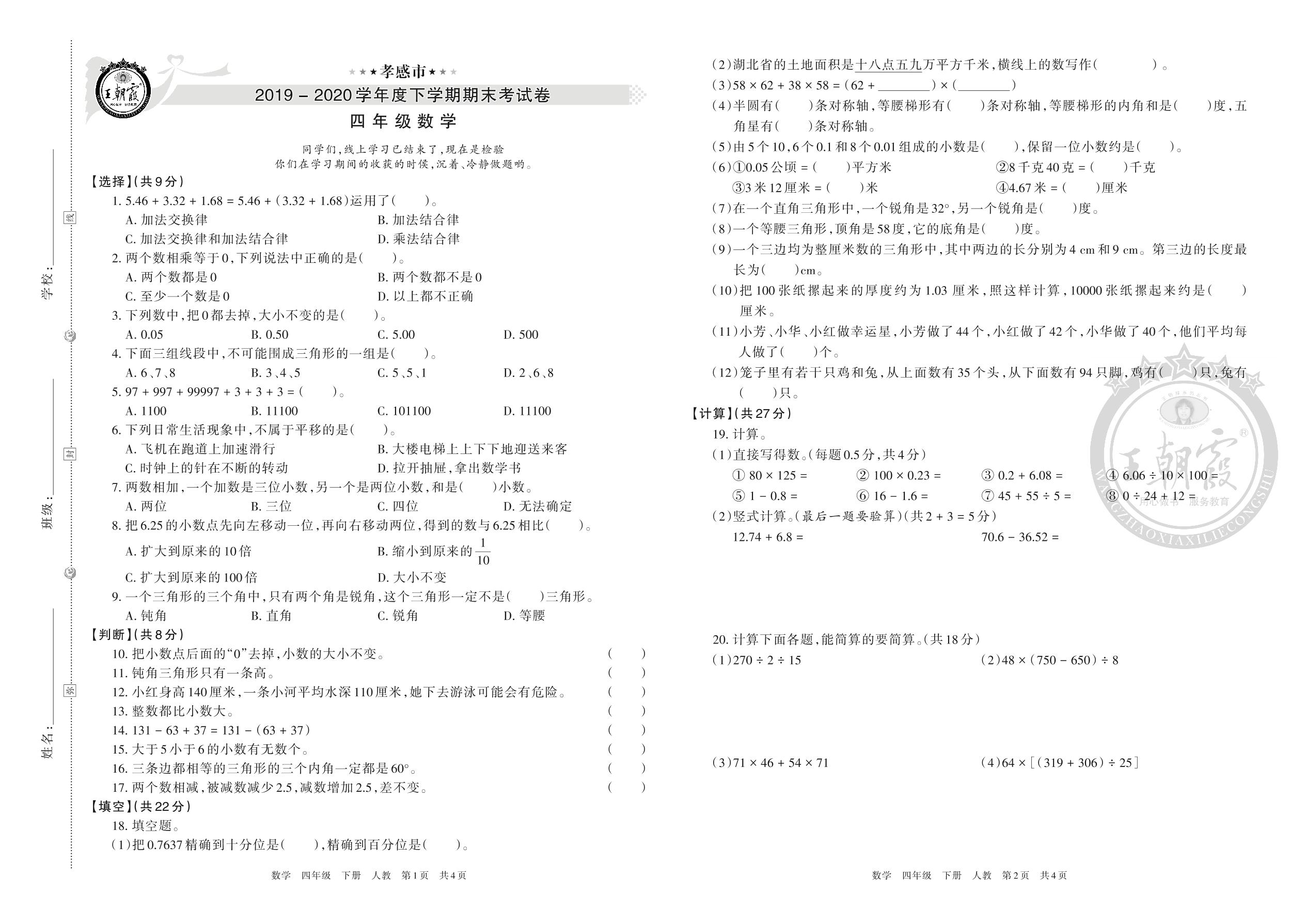 孝感市2019-2020学年度下学期期末考试卷四年级数学(人教版)