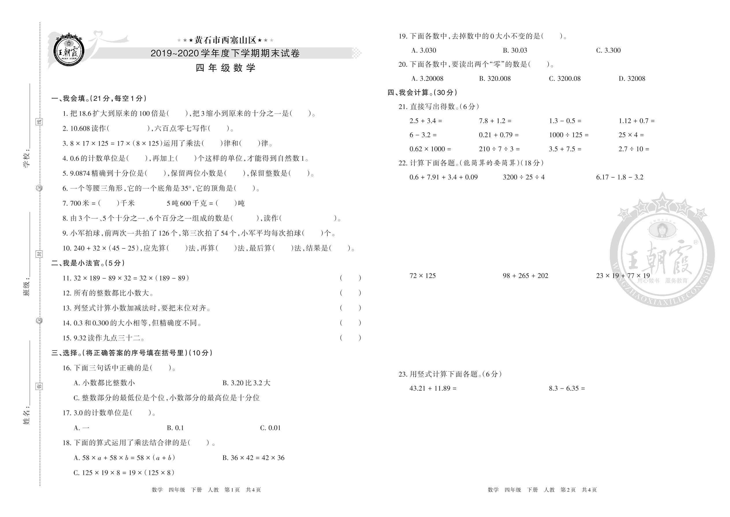 黄石市西塞山区2019~2020学年度下学期期末试卷四年级数学(人教版)