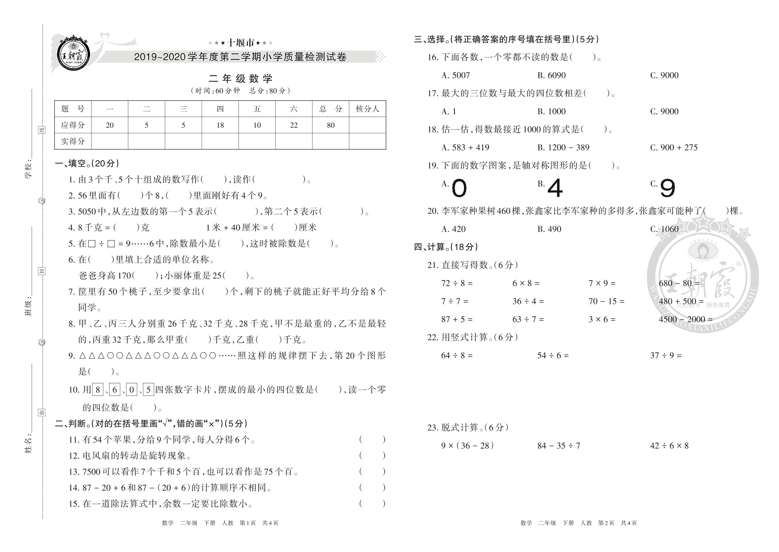 十堰市2019~2020学年度第二学期小学质量检测试卷二年级数学(人教版)