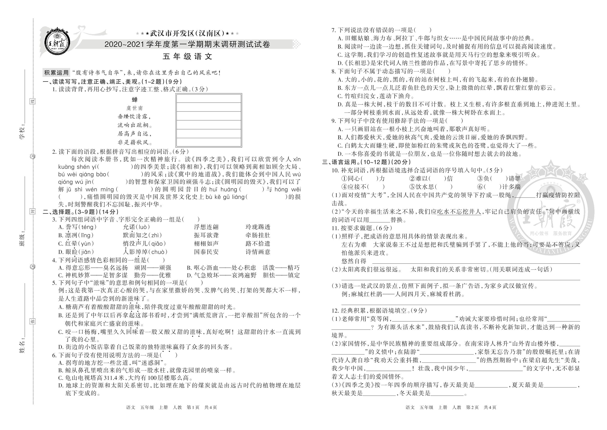 武汉市开发区(汉南区)2020-2021学年度第一学期期末调研测试试卷五年级语文(人教版)