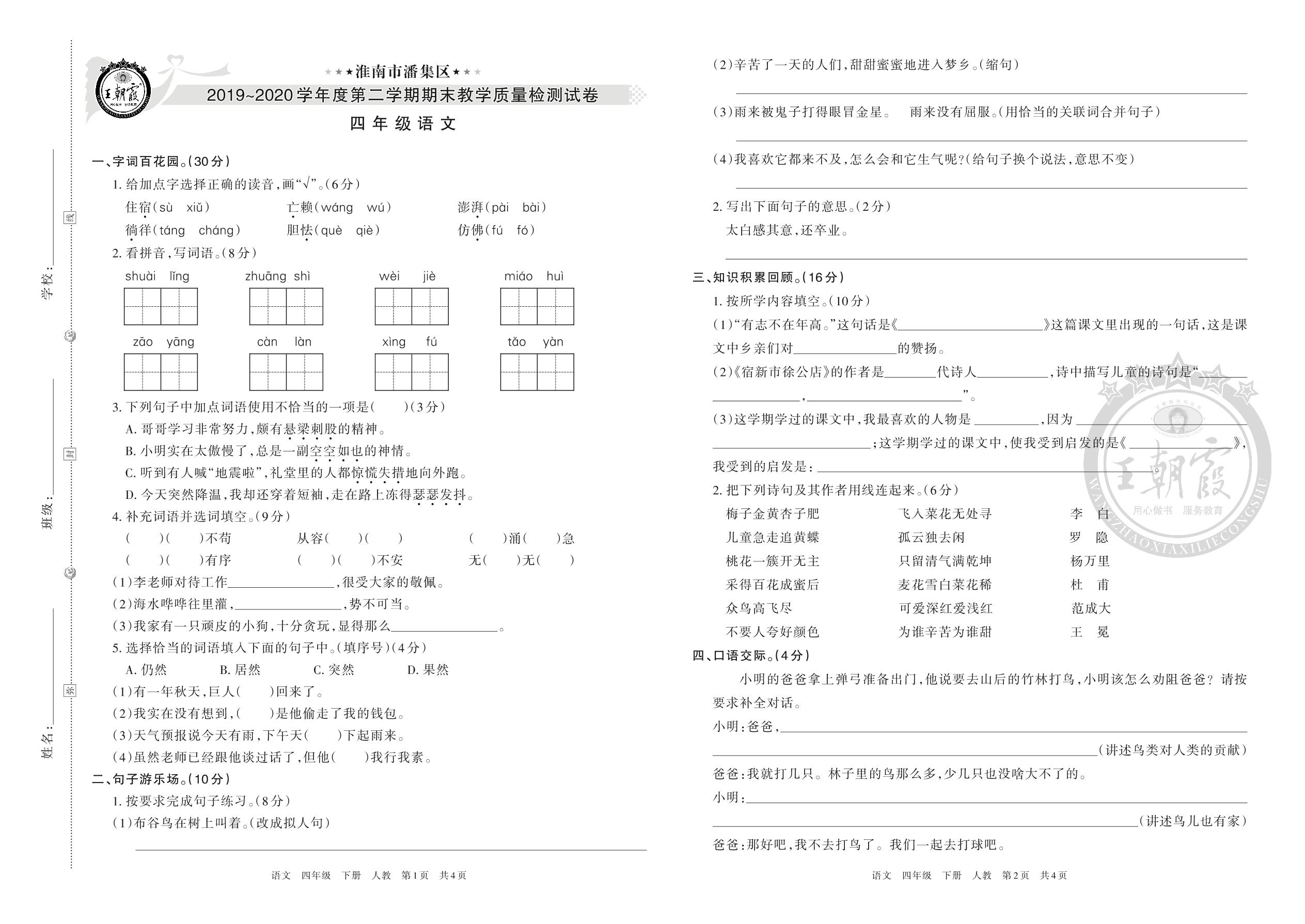 淮南市潘集区2019-~2020学年度第二学期期末教学质量检测试卷四年级语文(人教版)