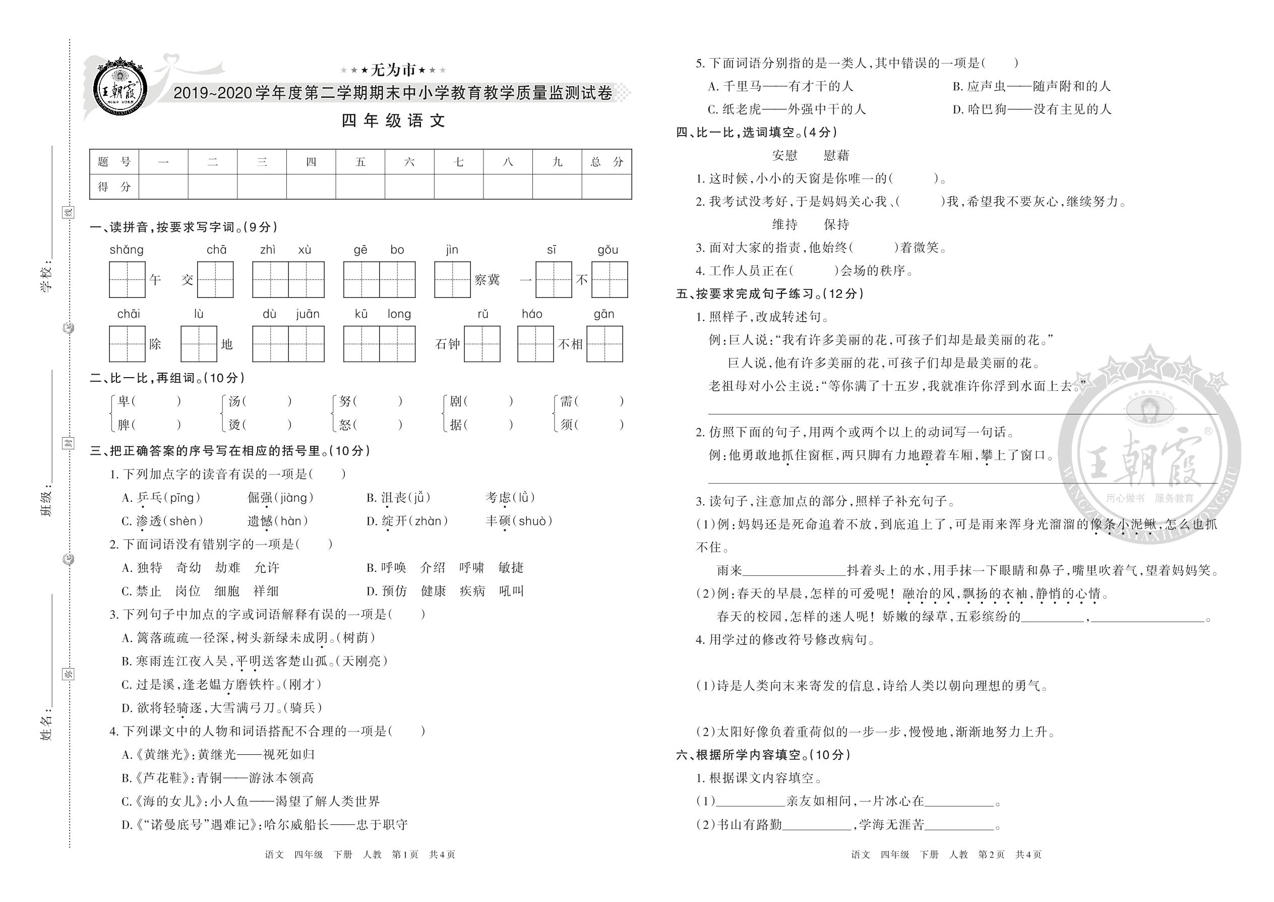 无为市2019-2020学年度第二学期期末中小学教育教学质量监测试卷四年级语文(人教版)